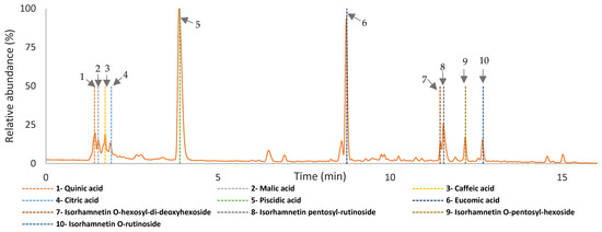 The chromatographic analysis of all infusions revealed similar peaks at 280 nm, suggesting that the same phenolic compounds were extracted regardless of the steeping conditions employed. The identification of the main phenolic compounds was based on UV data plus MS/MS data and further comparison with data from the literature. As observed in Figure 8 (a representative chromatogram of all infusions produced) and Table S1, the main compounds identified in the three Opuntia cultivars included piscidic acid, eucomic acid, and isorhamnetin derivatives. Not surprisingly, all these compounds matched the main phenolic components previously reported in juices with a fermented beverage and betalain-rich microparticles from the peel flour of O. ficus-indica [8,27,31,32].