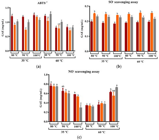 Variation in the (a) ABTS•+, (b) SO•, and (c) NO• scavenging capacity of prickly pear peel infusions cv ´Rossa´ (red peel) in red (▬), cv ‘Gialla’ (orange peel) in orange (▬), and cv ‘Bianca’ (white peel) in grey (▬) obtained from peel dried at 35 and 60 °C and steeped at 80, 90, and 100 °C. Results are expressed as the average ± SD (n = 3). Different lowercase letters above each bar indicate statistically significant differences (p < 0.05).