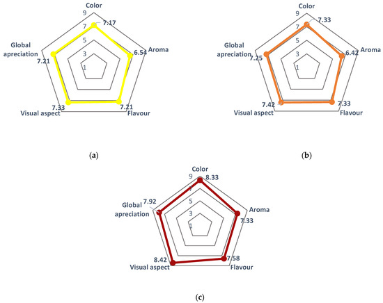 In order to understand the consumers’ acceptability of the infusion produced, a sensory evaluation was conducted on the prickly pear peel infusion. This study involved the utilization of three different cultivars and the use of peel dried at 35 °C and steeped at 100 °C, as these conditions yielded superior overall results, namely regarding the content of phenolic compounds, betalains, and the antioxidant capacity. The global appearance of the prickly pear infusions from the three cultivars was clearly distinguishable in terms of their color (Figure 11).