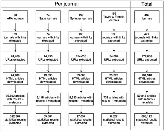 The data were collected in five steps: (i) collect journal lists; (ii) spider journal pages for articles; (iii) download articles; (iv) add article metadata; and (v) mine articles for statistical results. These five steps are specified below. All code and version history is available at [6]. Figure 1 gives a flowchart of the different steps in the data collection process.