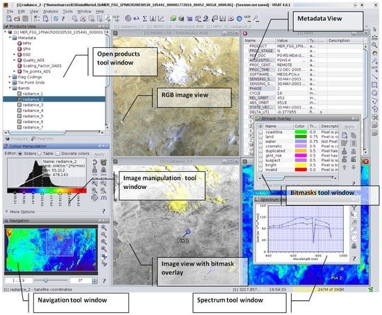 - VISAT: an intuitive desktop application used for Earth Observation (EO) data visualisation, analysis and processing (Figure 1) (version 5, Brockmann Consult GmbH, Geesthacht, Germany).