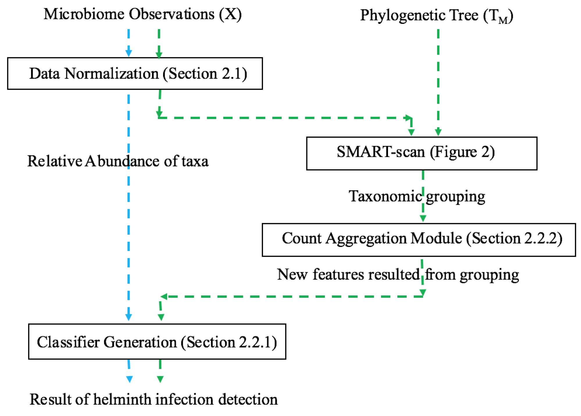 Figure 1 depicts the experimental design for testing our specific hypothesis for helminth data that: “there exists a phylogenetic dependency among two helminth-associated microbiota datasets which can be used by SMART-scan to extract clusters representing functional mapping to identify the association between taxa and phenotypes; and that use of this grouped data does not decrease the classification performance for infection detection over that of the ungrouped data models”. In this regard, we designed both baseline (from ungrouped data) and taxonomic (from grouped data) models, depicted in blue and green dashed paths in Figure 1, respectively. Baseline is a classification model that uses classifier generation explained in Section 2.2.1 below. The taxonomic model is the baseline model with an additional SMART-scan module, as explained in Section 2.2.2. The taxonomic tree can be easily extracted from the separate study publishing the helminth datasets. In the following subsections, we discuss both the set of classifiers selected for the system, and the taxonomic model that uses the SMART-scan algorithm in more detail.