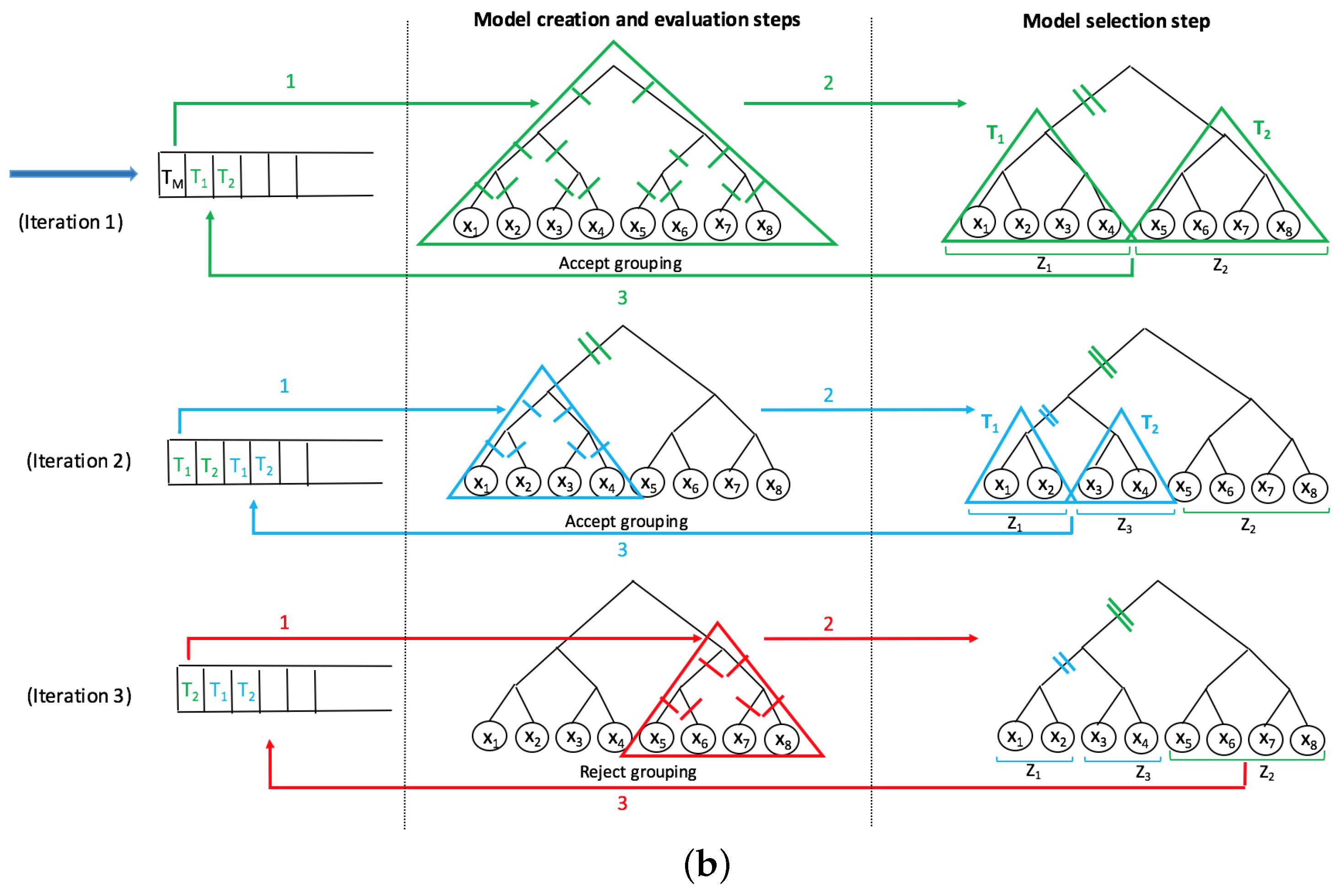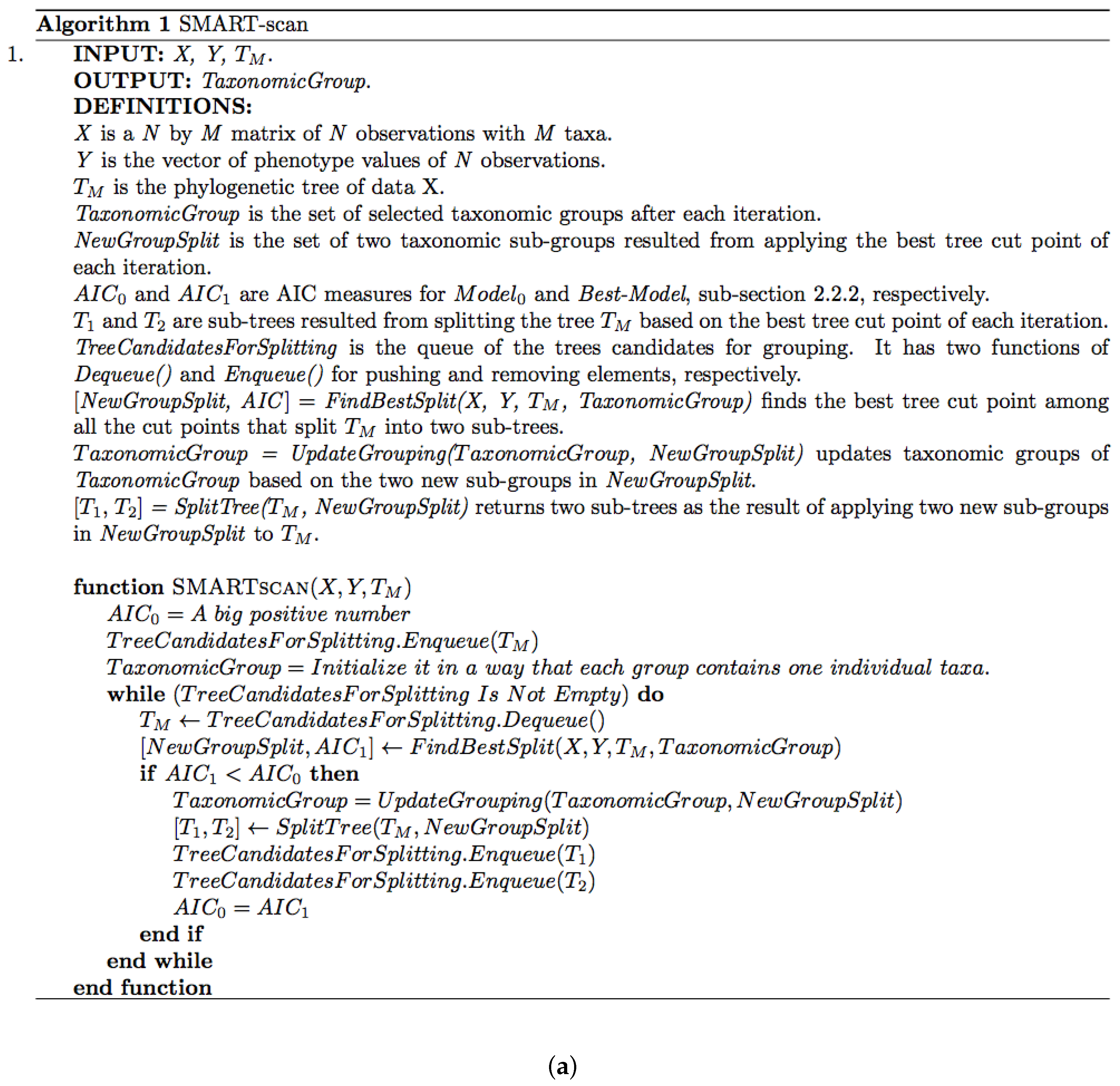 Figure 2 depicts the pseudocode and visualization of the first three iterations of the SMART-scan algorithm. In the pseudocode shown in Figure 2a, two main data structures are used: TreeCandidatesForSplitting and TaxonomicGroup. TreeCandidatesForSplitting is a queue that contains the tree candidates for splitting (grouping), initially filled with and TaxonomicGroup is the list of groupings, initially filled with the groups each containing one individual taxa. The three steps of the algorithm are covered in the While loop in a way that the model creation and evaluation steps have been implemented by FindBestSplit() function and the model selection step and the data structure updates have been implemented by the If statement and its inner instructions. In the visualization shown in Figure 1b, the first column shows the Enqueue and Dequeue functions applied to the TreeCandidatesForSplitting queue. The second column shows the sub-tree candidate for grouping and all its possible cut points. The third column shows all the tree cut points and the groups of taxa selected by the algorithm so far. The order of the actions in each iteration has been shown by numbered arrows. As it is shown in Figure 2b, the algorithm accepts groupings of the first two iterations, while it rejects the suggested grouping of the third iteration.