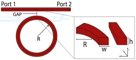 The proposed structure is based on a straight waveguide and a ring-shaped waveguide, which constitutes and all-pass configuration. Silicon nitride (Si3N4) was chosen for the waveguides core, embedded in a silicon dioxide (SiO2) cladding. Sellmeier equations were used to calculate the refractive indexes of SiO2 [23] and Si3N4 [24] at 1550 nm. Figure 1 shows the schematic of the all-pass MRR studied in this work, where R represents the radius of the ring-shaped waveguide and h and w denote the height and width of both waveguides, respectively. The parameter GAP is the separation between the straight waveguide and the ring-shaped waveguide. A tunable laser light source is connected to port 1, which allows scanning at wavelengths between 1500 and 1600 nm, while port 2 detects the resulting power transmitted through the system.