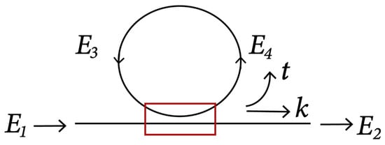 Scheme of light coupling in an all-pass (MRR). The red lines represent the coupling region between the straight waveguide and the microring, where the interaction occurs. The black arrows indicate the direction of light propagation in the system. The parameters and represent the coupling coefficient and the self-coupling coefficient, respectively.