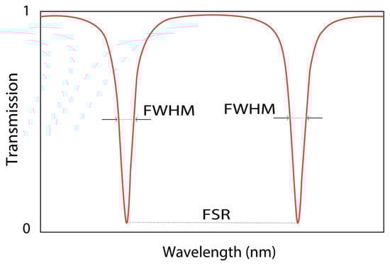 where the is the phase in which the light propagates within the ring, resulting in where is the optical path inside the ring () and k is the propagation constant (), where is the wavelength and is the effective index. The spectral response of an MRR can be obtained using Equation (3), and the typical transmission spectrum is shown in Figure 3. The of the MRR is generally a complex quantity, consisting of a real part, which determines the phase velocity, and an imaginary part, which is related to the material and structural losses. However, in the context of resonances, the phase condition is primarily governed by the real part of , as it determines the phase accumulation along the ring waveguide. This phase condition is expressed as , where m is an integer and is the wavelength. While the imaginary part of influences losses, it does not directly impact the phase condition necessary for achieving resonance. Therefore, the real part of is the primary focus for analyzing the spectral response of MRRs.