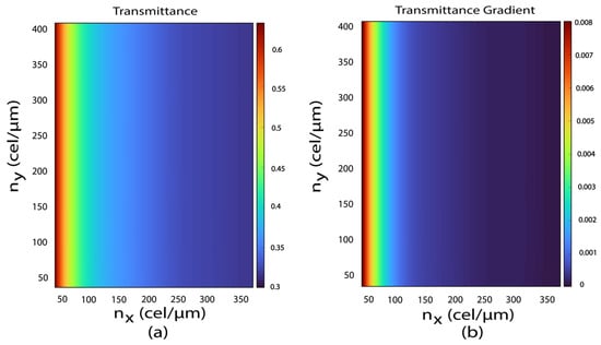 Figure 4 presents an example of a convergence analysis for an MRR made of on a substrate, with parameters , , , and . The horizontal () and vertical () axes represent the number of mesh elements (expressed in cel/) in their respective directions. In Figure 4a, the color scale represents the transmittance intensity for each combination of and , while in Figure 4b, it shows the gradient of the transmittance. The gradient shown in Figure 4b highlights the convergence: regions with high values (red) indicate instability, whereas low values (blue) confirm stability and convergence.