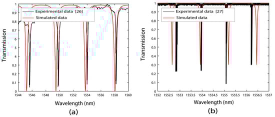 Experimental and simulated transmission spectra for a MRR reported in the literature: (a) with an MMR of R = 50 μm [26] and (b) with an MMR of R = 200 μm [27].