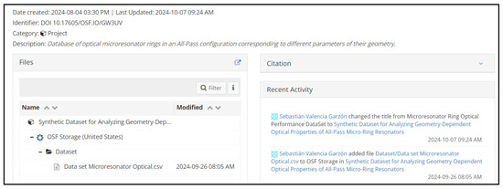 The dataset is hosted on OSF HOME, an open-source web application for research collaboration. It is available under the project folder “Synthetic Dataset for Analyzing Geometry-Dependent Optical Properties of All-Pass Micro-Ring Resonators”, which includes the original dataset file “Data set Microresonator optical.csv”, as shown in Figure 6. In this spreadsheet, the data are organized as described above.