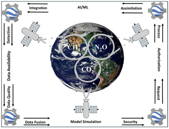 Despite the significant advantages of GEE in GHG monitoring, several challenges and limitations persist. One major hurdle is the complexity of algorithm optimization, which is critical for processing GEE’s vast and diverse datasets. Existing algorithms often struggle with the volume and heterogeneity of global datasets, leading to computational efficiency and precision issues [73]. Moreover, data interoperability remains a persistent challenge, as integrating datasets from sources such as Sentinel-5P, Landsat-8, and MODIS involves reconciling varying formats, resolutions, and temporal scales [74]. The limited historical depth of newer satellite missions, such as TROPOMI and Sentinel-5P, further restricts long-term trend assessments. However, older datasets, including MODIS and Landsat, help fill these gaps; for example, these older datasets have provided decades of consistent data for assessing long-term environmental changes, such as afforestation and deforestation trends [75]. Another significant issue is data access, where licensing and proprietary constraints limit collaboration and equitable use. High-resolution datasets, such as those from commercial satellites, are often inaccessible due to cost or restricted use [76]. However, open-access policies, such as those adopted by Copernicus and NASA, aim to mitigate these challenges by promoting unrestricted access to critical datasets [75]. Furthermore, certain regions’ atmospheric conditions and instrument constraints can lead to inconsistent data quality, especially in areas prone to cloud cover or extreme weather. For instance, ref. [74] noted that regions with frequent cloud cover require advanced processing techniques, such as cloud masking, to improve the accuracy of satellite-derived datasets.