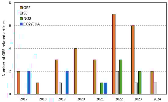 In recent years, GEE has been used to monitor GHG emissions globally, employing satellite-based CO2 and CH4 analysis to quantify emissions and identify emission hotspot sites [34]. For instance, GEE is used in Texas to monitor methane emissions from gas flaring, highlighting significant hotspots in the Permian Basin and Eagle Ford Shale regions, which are key contributors to CO2 and CH4 emissions [35]. Similarly, GEE has been utilized with Sentinel-5P data to analyze nitrogen dioxide (NO2) pollution in Madrid, Spain, identifying urban areas as critical hotspots for emissions [36]. Further showcasing its capabilities, GEE has been employed to track methane emissions in Canada’s poultry farming sector. Researchers have pinpointed emission trends across regions and seasons by integrating OCO-2 and Sentinel-5P data [37]. This study aims to comprehensively explore the applications of remote sensing data and technologies in monitoring and mapping GHGs using GEE. It includes Section 2: Methodology, Section 3.1: Progress and trends in the application of GEE, Section 3.2: Application of GEE to monitor CO2, Section 3.3: Application of GEE to monitor CH4, Section 3.4: Application of GEE to monitor nitrogen dioxide/nitrous oxide (NO2/N2O), and Section 3.5: Application of GEE to Monitor soil carbon. This review highlights how GEE enhances the monitoring and mitigating GHG emissions, emphasizing its potential contributions to environmental research and decision-making processes.