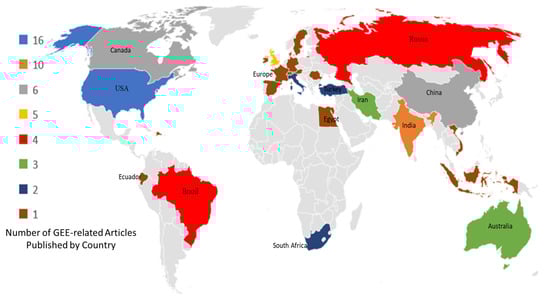 Visual representation of the number of GEE-related articles used in the review by countries between 2017 and2024.