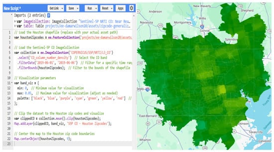 Spatial visualization of carbon monoxide (CO) concentrations over Houston, Texas using Sentinel-5P data in GEE. On the left, the GEE script processes the CO data by defining the Texas boundary, filtering the dataset for 2022, and calculating the mean CO concentration.