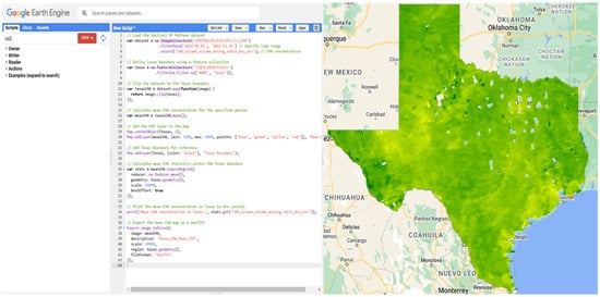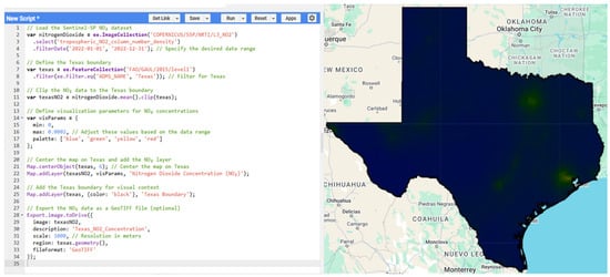 The spatial distribution of nitrogen dioxide (NO2) concentrations over Texas, visualized using GEE and Sentinel-5P data. On the left, the GEE script processes NO2 data by defining the Texas boundary, filtering the dataset for a specific date range (2022), and applying visualization parameters with a color gradient (blue to red) representing varying NO2 levels. On the right, the map displays NO2 concentrations across Texas, with notable hotspots in certain regions indicating higher emissions or pollution levels.
