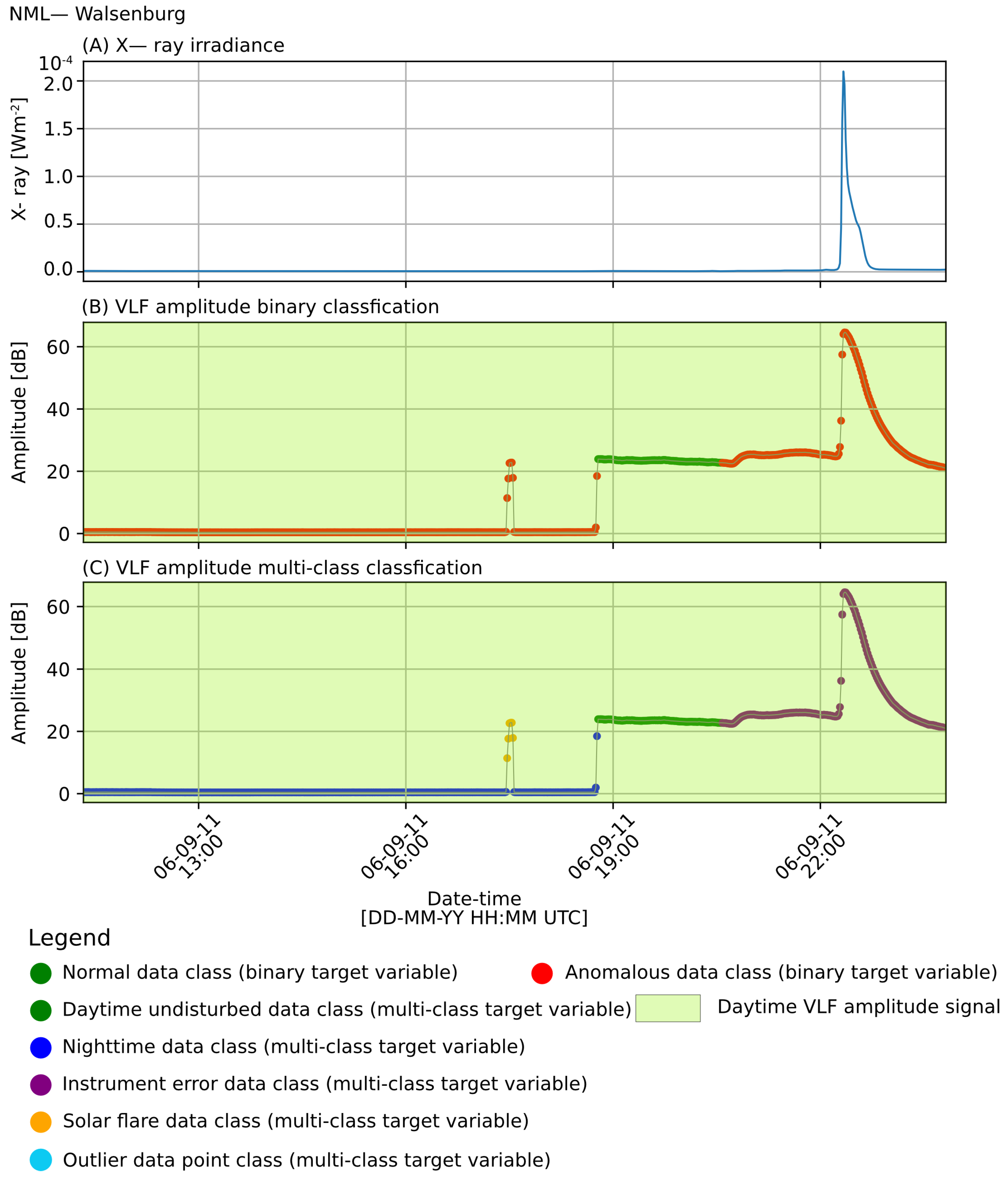 17], identified five distinct data classes, with an additional sixth class incorporated during the initial data labeling process. The data categories include daytime undisturbed signal (daytime signal undisturbed by solar flare effects), nighttime signal (usually larger amplitude values than daytime amplitude signal), solar flare effects (characteristic features of solar flare on VLF amplitude marked by an abrupt increase in signal amplitude with a gradual decrease), instrumental errors (constant zero or non-zero values), outlier data points (individual or few data points distinct from surrounding data points), and an additional data class for instrumental noise (rapid fluctuation of VLF amplitude which is non-characteristic for the VLF amplitude signal). A comprehensive description of the conditions for each data class is available in Arnaut et al. [