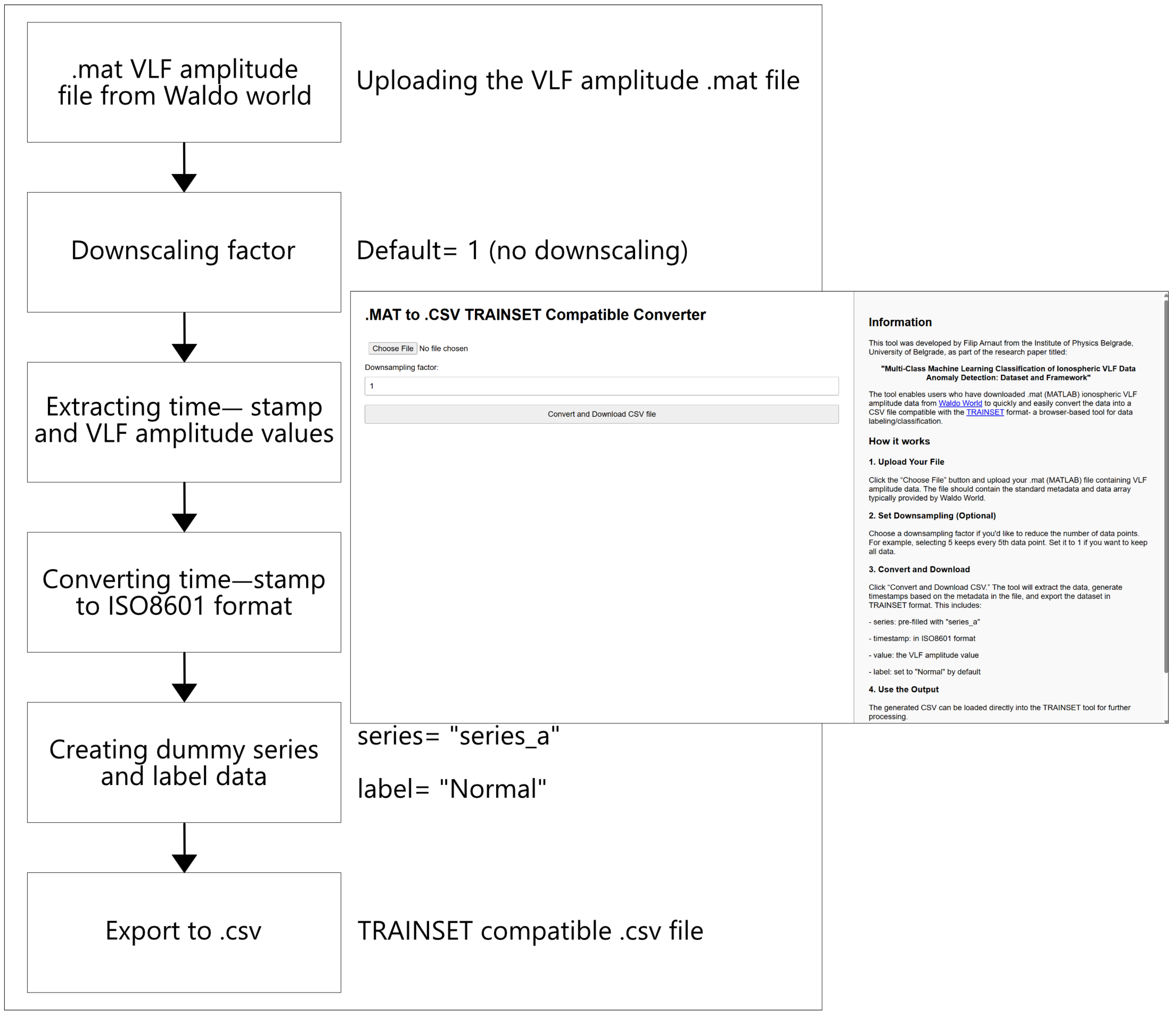Supplementary Materials) to convert MATLAB VLF amplitude data into a .csv file compatible with TRAINSET, a web-based application designed for efficient data annotation. Furthermore, the web-based tool finalizes a completely free pipeline from the data repository WALDO to the open-source labeling tool TRAINSET, serving as a significant resource that facilitates researchers in navigating various data formats and labeling selected data with ease.