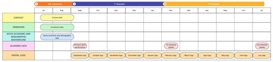 Due to the existence of transfers of academic records between degree programs or schools, of equivalent but not recognized courses, the occurrence of dropouts can take place at any stage, although a large proportion occurs during the first academic year through processes such as access to non-preferred degree programs, failing subjects, and non-attendance to classes. Consequently, the collected information is at the student level for each course-degree-school-campus combination. In the following figure, all the stages and information enabling the systematic and real-time collection of each student’s trajectory are presented in Figure 1.