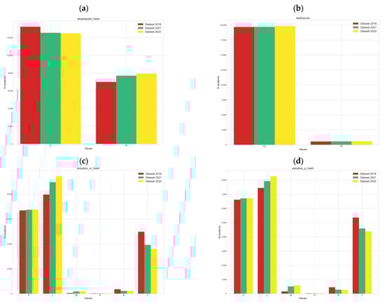 Although recent open datasets [,,] have enabled advances in dropout prediction and academic success research, their scope remains limited. Datasets based on virtual learning environments, such as MOOCs, allow for the use of learning analytics derived from digital interaction []. In other cases, dropout is analyzed with a focus on many sociodemographic variables because tuition fees are relatively high []. However, current databases usually provide information on undergraduate students and generally focus on the first year or the first two semesters. These databases have a significant limitation in that they focus on the context where dropout tends to be the most prevalent, and rarely combine institutional data with digital engagement metrics such as LMS activity and Wi-Fi access patterns.