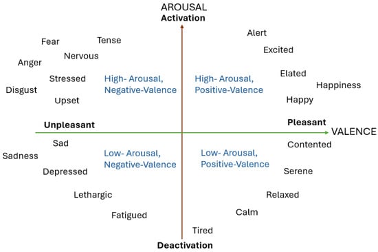 Continuous emotion representation offers a promising alternative to the categorical model, moving beyond discrete labels and capturing the nuances of human emotions on continuous scales. The two most common approaches are two-dimensional (2D) and three-dimensional (3D) emotional space models. In the first model, emotions are divided into valence (ranging from pleasant to unpleasant) and arousal (ranging from calm to excited). The Circumplex model, illustrated in Figure 2, describes the emotions along the valence and arousal axes, and suggests a mapping with discrete emotions based on the combination of the positive and negative states of valence and arousal [38]. The second model is the valence–arousal–dominance (VAD) model, which maps three continuous dimensions: valence (positive to negative), arousal (high or low activation), and dominance (feeling in control or feeling controlled) [39]. These expanded models aim to capture a broader spectrum of emotional experiences.