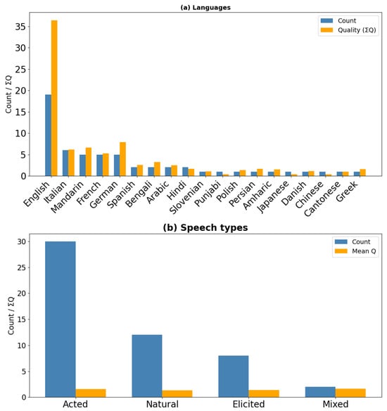In this section, we present a comprehensive overview of the databases for speech emotion recognition available in the literature. Table 2 compares these databases in terms of corpus name, reference, year of publication, speech language(s), speech type (natural, elicited, or acted), number of speakers, considered emotions, voice recording conditions, and emotion annotation methods. It summarizes the key parameters of the reviewed databases, serving as a descriptive reference to support the comparative analysis developed in our narrative review. To complement Table 2, Figure 3 provides an at-a-glance descriptive view of the inventory: the blue bars show the raw distributions of corpora by language and by speech type; the quality-weighted views (orange bars) are interpreted in Section 7.