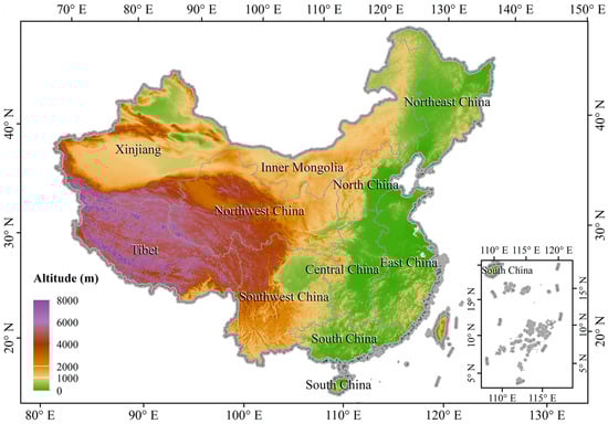 This research area covers China, which is located in the eastern part of Asia and on the western coast of the Pacific Ocean. China’s terrain distribution presents a three-level pattern, with the western region being high and the eastern region being relatively low (as shown in Figure 1). The Chinese territory features a rich variety of landforms, such as plains, plateaus, mountains, hills, and basins. The plain areas are distributed mainly in the eastern part of China, such as on the Northeast China Plain, on the North China Plain, and in the middle–lower Yangtze Basin. These areas are the main grain production bases of China. These regions are densely populated, with fertile soil and abundant water resources, creating favourable conditions for the large-scale development of agriculture. In contrast, the western part of China is dominated by plateaus and basins. Owing to its high altitude, the climate is cold and dry, with few large-scale crop cultivation areas. In terms of climate, the regional climate characteristics of China are greatly influenced by the thermal differences between land and sea, resulting in a significant monsoon climate and continental climate features [36]. This monsoon climate leads to distinct dry and wet seasons, as well as four clear seasons in the eastern regions, where winters are dry and cold and summers are humid and rainy. The influence of terrain also results in a pattern in which the eastern coastal regions receive more rainfall than other regions do, whereas the western inland regions are arid and receive less rainfall [37,38]. In the eastern regions, the rainy season and high-temperature season begin earlier and last longer in the southern region, whereas in the northern region, they start later and last for a shorter period. This climatic difference results in different agricultural production characteristics between the southern and northern regions of China. Moreover, with global climate change, the originally wet and hot summers in southern China may experience delayed or shortened rainy seasons, leading to summer droughts, which in turn affect the yield of autumn crops such as rice and corn [39]. Therefore, conducting real-time and accurate drought monitoring for China’s regions, as well as analysing the development trends of the intensity and spatial range of droughts, is extremely important for agricultural and socioeconomic development [40]. Figure 1 shows the meteorological and geographical primary zoning of China by the China Meteorological Administration, which divides the region of China into 10 areas, including five regions in the eastern part of the country with low terrain and dense populations: Northeast China, North China, Central China, East China, and South China.