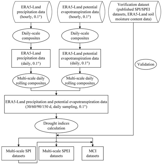 The dataset production and technical verification process in this study involved 3 steps (Figure 2): meteorological data preprocessing, drought index calculation and the validation of drought index datasets. (1) In the process of preprocessing meteorological data, the hourly precipitation and potential evapotranspiration data from ERA5-Land were converted into daily cumulative data, which were then converted into daily cumulative precipitation data and potential evapotranspiration data for the last 30, 60, 90, and 150 days; (2) in the process of calculating drought indices, the output results from the previous step were employed to obtain multi-scale SPI and SPEI datasets, which were subsequently used to establish MCI datasets; (3) in the process of validating the drought index datasets, two previously published drought index datasets were employed to evaluate the accuracy of the drought index datasets produced in this study. In addition, soil moisture content data for different depths from ERA5-Land were adopted to evaluate the performance of the different drought indices established in this study in measuring drought severity. The key data and methods in the dataset production and technical verification processes are detailed in the following sections.