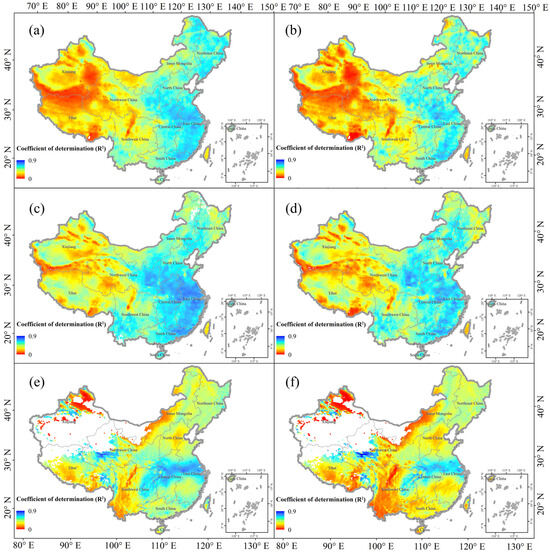 Spatial distribution of R2 values between SPIHSTR_China and SPIZhang and between SPEIHSTR_China and SPEIZhang (or SPEI-GD) at 30- and 90-day scales in the region of China: (a) SPI30dHSTR_China and SPI30dZhang (1980–2018); (b) SPI90dHSTR_China and SPI90dZhang (1980–2018); (c) SPEI30dHSTR_China and SPEI30dZhang(1980–2018); (d) SPEI90dHSTR_China and SPEI90dZhang (1980–2018); (e) SPEI30dHSTR_China and SPEI-GD (1983–2021); (f) SPEI90dHSTR_China and SPEI-GD (1983–2021).