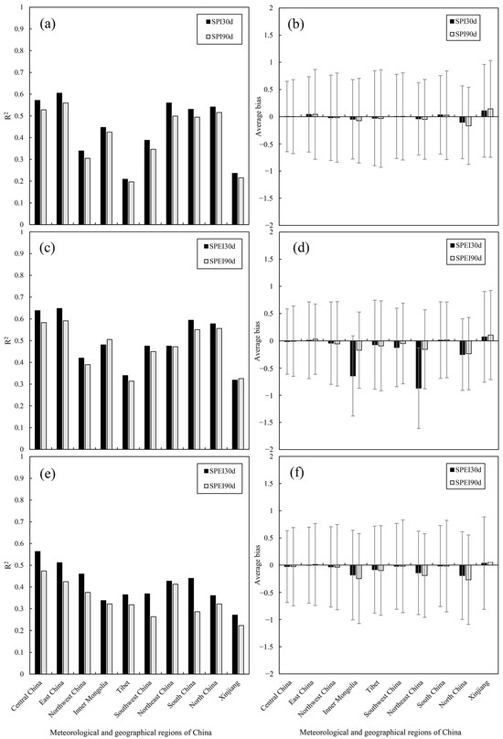 Average R2 values, average biases and RMSEs of the fitting between SPIHSTR_China and SPIZhang and between SPEIHSTR_China and SPEIZhang (or SPEI-GD) at 30- and 90-day scales in different meteorological and geographical regions of China: (a) R2 values between SPIHSTR_China and SPIZhang (1980–2018); (b) Average biases and RMSEs of the fitting between SPIHSTR_China and SPIZhang (1980–2018); (c) R2 values between SPEIHSTR_China and SPEIZhang (1980–2018); (d) Average biases and RMSEs of the fitting between SPEIHSTR_China and SPEIZhang (1980–2018); (e) R2 values between SPEIHSTR_China and SPEI-GD (1983–2021); (f) Average biases and RMSEs of the fitting between SPEIHSTR_China and SPEI-GD (1983–2021). The amplitude lines on the average biases represent the RMSEs of the fitting between the input data pairs. The p-values in hypothesis test are all less than 0.01.