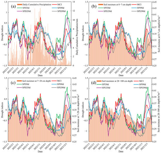 Comparative analysis of various drought indices with daily cumulative precipitation and multilayer soil moisture (eastern part of China from 1 January to 31 December 2022): (a) Drought indices and daily cumulative precipitation; (b) Drought indices and soil moisture at 0–7 cm depth; (c) Drought indices and soil moisture at 7–28 cm depth; (d) Drought indices and soil moisture at 28–100 cm depth.