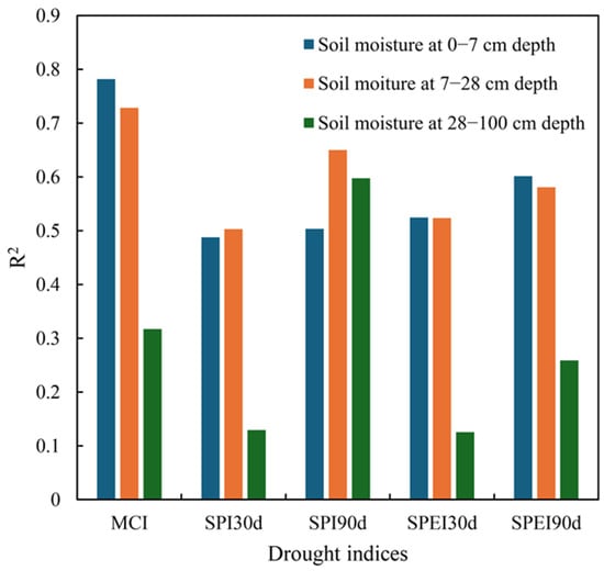 On the basis of the drought index dataset generated from this study, daily average processing was performed for the multiscale drought indices (MCI, SPI and SPEI at 30- and 90-day scales), cumulative precipitation, and soil moisture at different depths in the eastern part of China. Figure 5 shows the daily average MCI, SPI and SPEI at the 30- and 90-day scales, as well as the corresponding daily average cumulative precipitation data and soil moisture data at different depths for the eastern part of China from 1 January to 31 December 2022; these values were calculated on the basis of the ERA5-Land dataset. Among the five drought indices studied, the trend of the MCI is most consistent with the characteristics of daily cumulative precipitation changes, followed by those of the SPI and SPEI at the 30-day scale, whose changes slightly lag behind those of the daily cumulative precipitation. The changes in the SPI and SPEI at the 90-day scale significantly lag behind those in the daily cumulative precipitation (as shown in Figure 5a). These results indicate that among the five drought indices, the MCI is most sensitive to daily cumulative precipitation changes and can most accurately reflect the impact of recent precipitation on drought relief in a timely manner. In addition, among the five drought indices, the trend and magnitude of change in the MCI with date are most consistent with the changes in soil moisture at the 0–7 and 7–28 cm depths (as shown in Figure 5b,c), and the R2 values between the MCI and soil moisture at the 0–7 and 7–28 cm depths are greater than 0.7, indicating a significant correlation (as shown in Figure 6). All the specific values in Figure 6 are described in Table S2 in the Supplementary Materials. The trends of the SPI and SPEI at the 30-day scale are also consistent with the changes in soil moisture at the 0–7 and 7–28 cm depths, but the degree of fit between the variations in these two drought indices with dates and soil moisture at 0–7 and 7–28 cm is relatively low, with R2 values of approximately 0.5, indicating a relatively low correlation. The trends of the SPI and SPEI at the 90-day scale also lag behind the daily variations in soil moisture, which are similar to the findings of previous studies [12,23]; however, compared with those at the 30-day scale, the variations in the SPI and SPEI at the 90-day scale are closer to the variations in soil moisture in the shallow and middle layers, with the R2 values for soil moisture at 7–28 cm reaching above 0.6; these results indicate that at the overall level, the SPI and SPEI at the 90-day scale can more accurately reflect the variations in soil moisture in the shallow and middle layers in eastern part of China. Therefore, overall, the variations in soil moisture in the shallow and middle layers in the eastern part of China are affected mainly by short-term droughts. The variation trend of the soil moisture at the 28–100 cm depth is relatively less consistent with the variations in the MCI, SPI, and SPEI at the 30-day scale (as shown in Figure 5d), among which the R2 value between the MCI and the soil moisture at the 28–100 cm depth is approximately 0.3, and the R2 values between the SPI and SPEI at the 30-day scale and the soil moisture at the 28–100 cm depth are approximately 0.1 (as shown in Figure 6), indicating low correlations. Therefore, the above results indicate that the MCI, SPI, and SPEI at the 30-day scale cannot accurately reflect the changes in soil moisture at the 28–100 cm depth. However, the degree of fit between the soil moisture at the 28–100 cm depth and the changes in the SPI and SPEI at the 90-day scale is high. In addition, the R2 values between the soil moisture at the 28–100 cm depth and the SPI at the 90-day scale reach approximately 0.6, indicating a relatively high correlation. Therefore, the SPI at the 90-day scale can accurately reflect the variations in deep soil moisture.