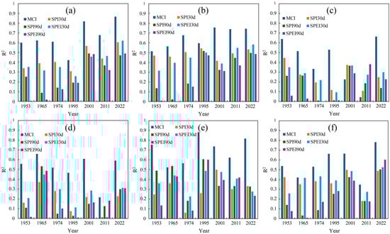 Via the use of the methodologies outlined in Section 2.9, seven years between 1951 and 2022, when key drought events occurred, were selected to evaluate the monitoring capabilities of drought indices on the basis of publicly available meteorological drought studies. In addition, daily average processing was performed on the MCI, SPI and SPEI data at 30- and 90-day scales in five meteorological and geographical regions in the eastern part of China, as well as soil moisture at 0–7 cm depth, resulting in daily average drought indices and average soil moisture at 0–7 cm for each meteorological and geographical region in the eastern part of China. Linear regression analysis was used to calculate the R2 values between each drought index and the 0–7 cm soil moisture in different years, and the results are shown in Figure 7. All the specific values in Figure 7 are described in Table S3 in the Supplementary Materials. In the five meteorological and geographical divisions, compared with the SPI and SPEI, the MCI had higher R2 values with 0–7 cm soil moisture in most of the selected years, which is consistent with the results of the correlation analysis between different drought indices and 0–7 cm soil moisture across the eastern part of China in the previous section. These results indicate that, from 1951 to 2022, the MCI dataset generated in this study exhibited greater monitoring capabilities for shallow soil moisture in various meteorological and geographical regions and across different decades than did the SPI and SPEI. In the five meteorological and geographical regions of the eastern part of China, the drought monitoring indices in Central China, East China, and North China presented relatively high R2 values with 0–7 cm soil moisture, with the MCIs in these regions having R2 values above 0.6 in most years and even reaching above 0.8 in some years. These findings demonstrate that the MCI dataset generated in this study has significant value for monitoring the shallow soil moisture content in Central China, East China, and North China.