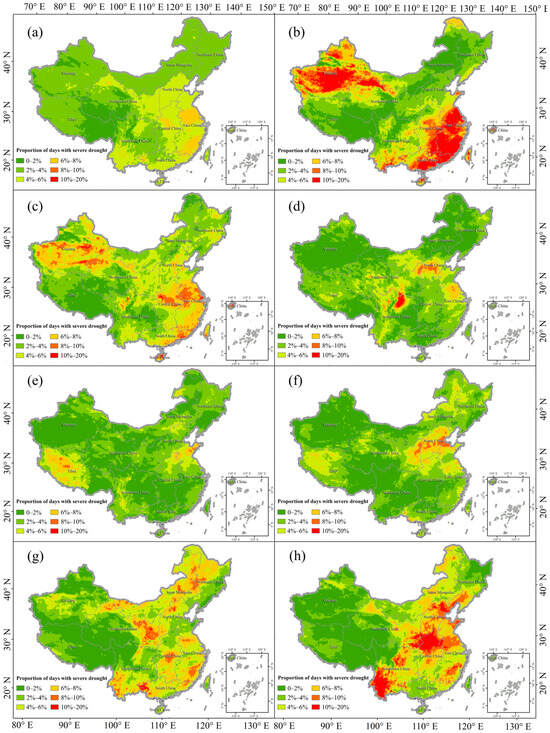 Proportion of days with severe drought or above between 1951 and 2020 and in each decade within the selected period: (a) 1951–2020; (b) 1951–1960; (c) 1961–1970; (d) 1971–1980; (e) 1981–1990; (f) 1991–2000; (g) 2001–2010; (h) 2011–2020.