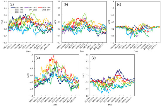 In each decade from 1951–2020, the daily average MCI values in various meteorological and geographical regions within the eastern part of China: (a) Central China; (b) East China; (c) Northeast China; (d) South China; (e) North China.
