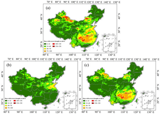 Spatiotemporal distribution of days with severe drought or above in China in 2022 (based on the MCI): (a) All year; (b) The first half of the year; (c) The second half of the year.