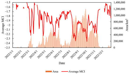 The analysis in the previous section revealed that since the beginning of the 21st century, the frequency of severe drought events in the eastern part of China has significantly increased. In particular, from spring to autumn in 2022, the eastern part of China, which is centred on the mid-lower Yangtze Basin, experienced severe drought. Therefore, the MCI dataset generated in this study was utilized to conduct an in-depth analysis of the spatial extent and temporal duration of drought in the eastern part of China in 2022. Figure 10 shows the distribution of days reaching severe drought status across various meteorological and geographical regions of China throughout 2022, as well as the first and second halves of the year. Except in Northeast China and the southern part of South China, most of the eastern part of China experienced more than 10 days of severe drought or above in 2022. The areas with more days of severe drought or above were mainly concentrated in Central China and East China, where most areas in East China had more than 40 days, and most areas in Central China had more than 70 days, with some areas exceeding 100 days at these drought levels. Figure 11 shows the daily areas of severe drought or above and the average MCI values in the drought regions in the eastern part of China in 2022. Continuous severe drought began in April and lasted until the end of November. The entire process can be divided into two main drought stages. The first stage lasted from early April to early July. According to Figure 10b, the drought affected mainly the southern part of North China, the northern part of Central China, and the northern part of East China during this period. The maximum daily area of severe drought reached 619,479 square kilometres, occurring on May 23rd; the minimum daily average MCI value in the drought regions was −2.24, reaching the level of extreme drought. The second drought stage lasted from the end of July to the end of November. According to Figure 10c, drought affected mainly the central and southern parts of Central China and East China (the mid-lower Yangtze Basin). The maximum daily area of severe drought reached 1,201,793 square kilometres, occurring on September 29th; the minimum daily average MCI value of the drought regions was −2.36. Compared with the previous drought that occurred in northern China, this drought in the mid-lower Yangtze Basin was more severe, wider in impact range, and longer in duration. The above analysis results for drought duration and spatial extent based on the MCI dataset are highly consistent with those published previously [72,73], which verifies the reliability of the MCI dataset generated in this study for analysing spatiotemporal changes in specific drought events.