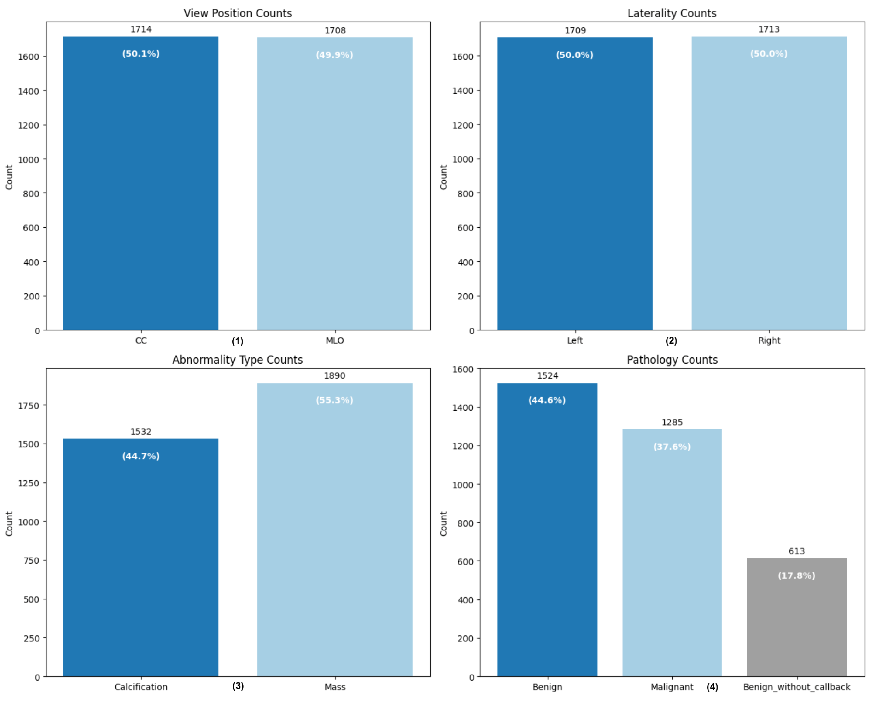 Figure 1. The dataset preserves the same distribution patterns as the original CBIS-DDSM resource. Slightly more images correspond to the left breast (52.3%) than the right (47.7%). The mediolateral oblique (MLO) view is slightly more frequent (53.2%) than the craniocaudal (CC) view (46.8%). Calcifications constitute the majority abnormality type (61.9%), followed by masses (38.1%). In terms of pathology, malignant lesions account for 43.7% of cases, benign lesions for 35.0%, and benign findings without callback for 21.3%.