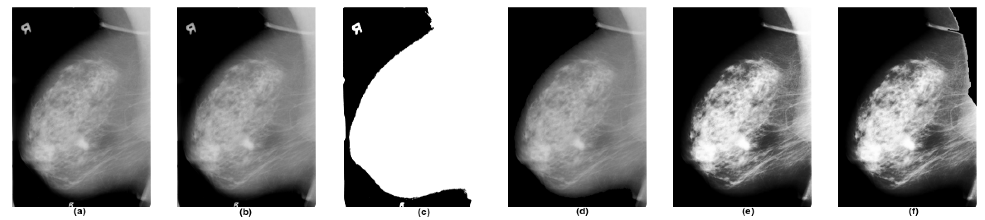 Figure 2, illustrates the sequential steps of a preprocessing pipeline designed for mammograms. This process transforms a raw image into a clean, standardized version suitable for radiomics analysis. Each panel in the figure represents the output of a specific filter or method applied in a step-by-step manner.