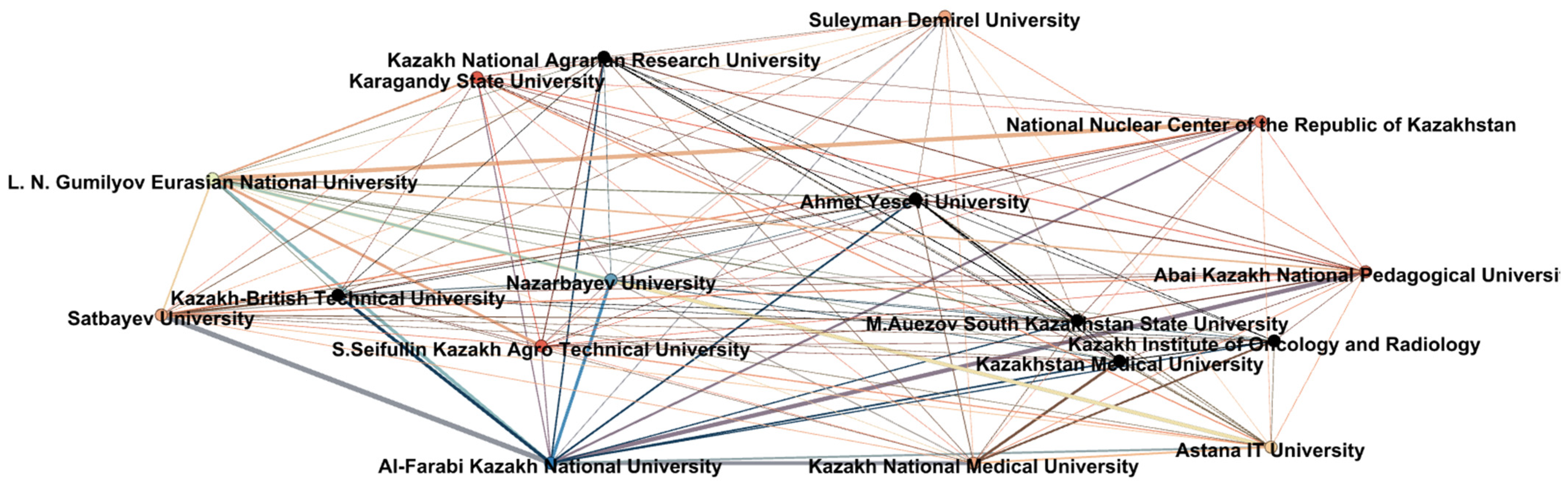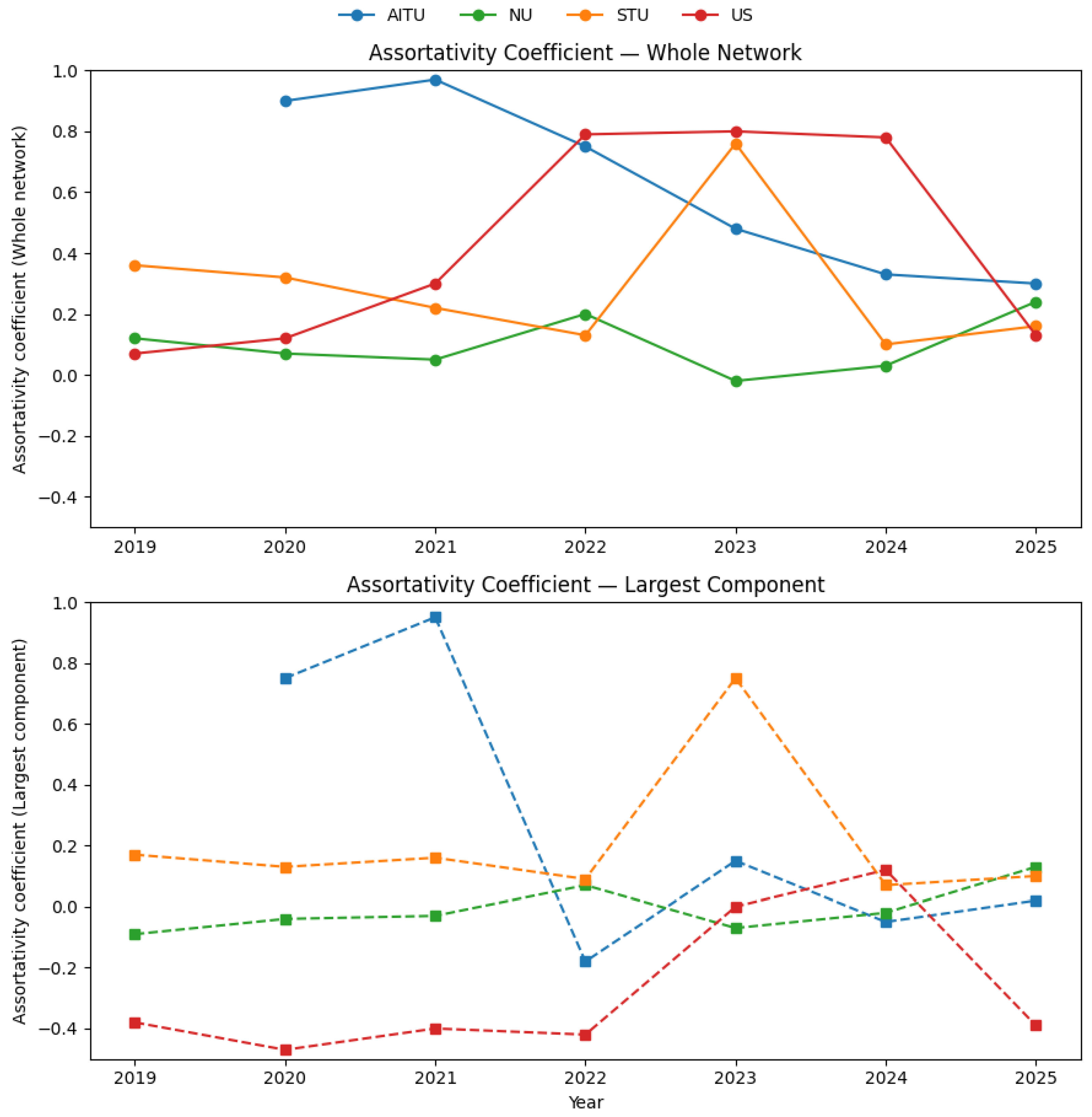 The comparative assessment of collaboration structures at AITU, NU, STU, and US reveals how differences in institutional scale, research intensity, and disciplinary diversification shape the internal cohesion of scientific networks. Despite sharing the general features typical of academic collaboration systems (sparse connectivity and a high tendency for local clustering), these four universities differ significantly in both size and the density of their internal relationships.