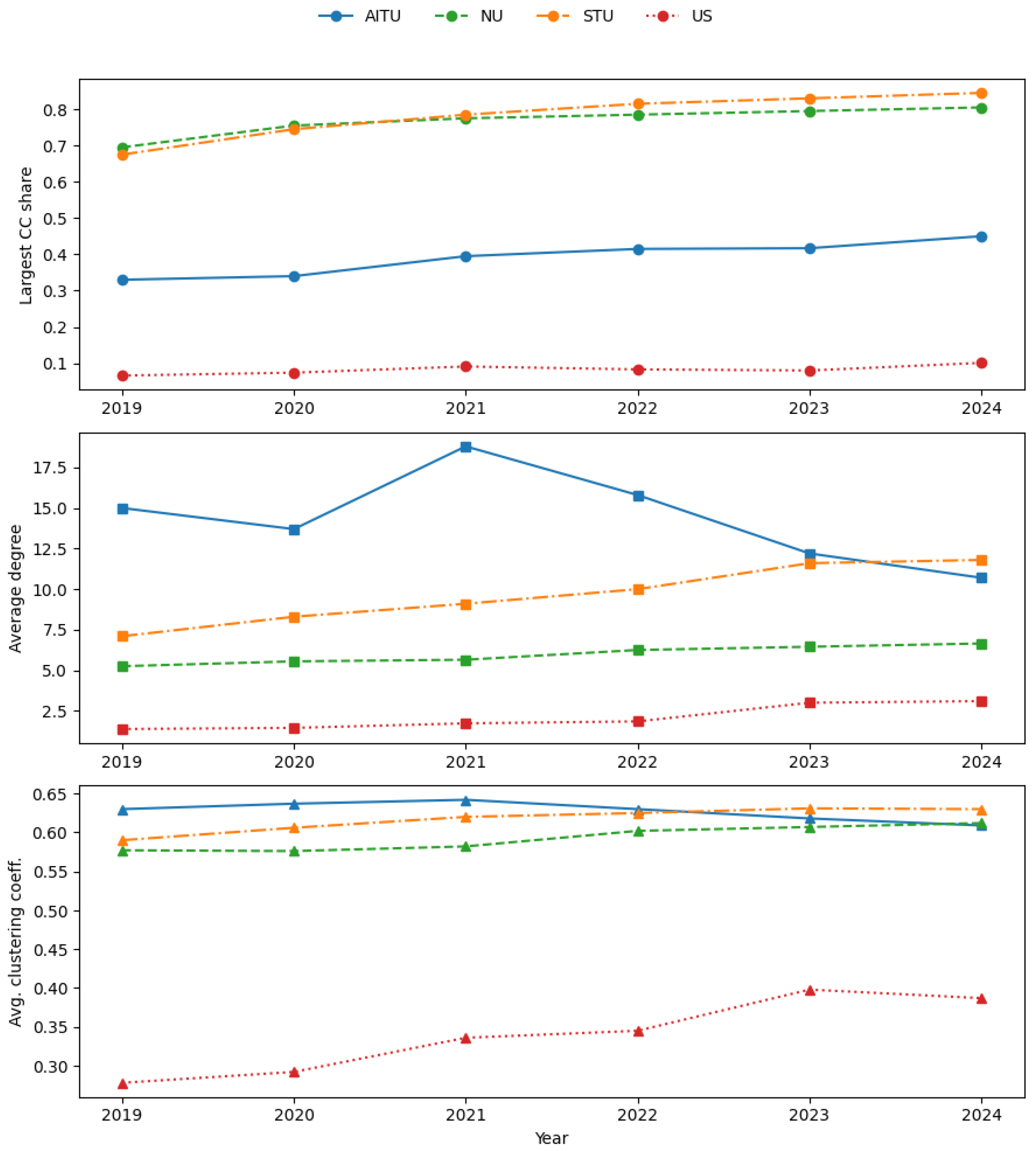 The degree of local cohesion, reflected in clustering coefficients, further clarifies these structural contrasts. The clustering coefficient remains remarkably similar for AITU, NU, and STU (each around 0.61–0.62), pointing to a pronounced presence of small, tightly connected research groups. In the case of STU, this parameter increased from 0.59 in 2019 to 0.63 in 2025, which indicates gradual consolidation of collaboration networks and a strengthening of internal group boundaries. Conversely, the university exhibits a substantially lower clustering coefficient (approximately 0.40), signifying fragmentation and weaker interconnection between local clusters. This reduced cohesion reflects its dependence on individual research initiatives rather than long-term institutional collaboration programs.