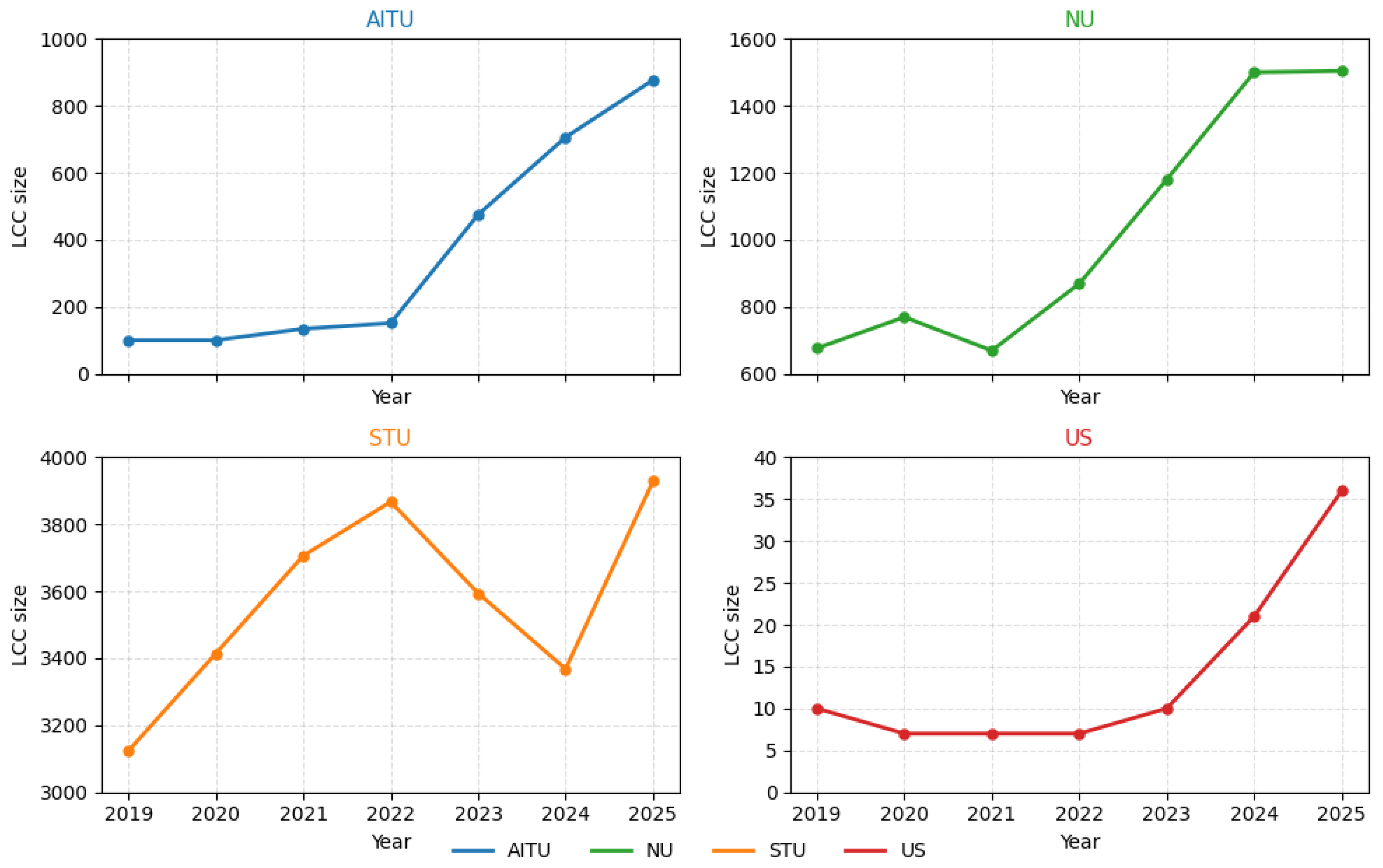 The level of integration within each network can also be evaluated through the largest connected component (LCC), the portion of researchers linked into a single, uninterrupted collaboration structure. Here, too, the hierarchy is consistent with other measures: STU’s LCC includes seven thousand seventy-four authors, or roughly 84.6% of its entire network; NU retains a similar proportion at 81% (three thousand one hundred thirty-one authors); AITU connects about half of its researchers (one thousand six hundred ten, or 50%); while US remains the most fragmented, with only one hundred twenty-seven authors (≈22%) belonging to its core. Notably, AITU’s share of the LCC rose markedly after 2022, reaching 45.1% by 2024, which confirms an ongoing process of consolidation and institutional networking.