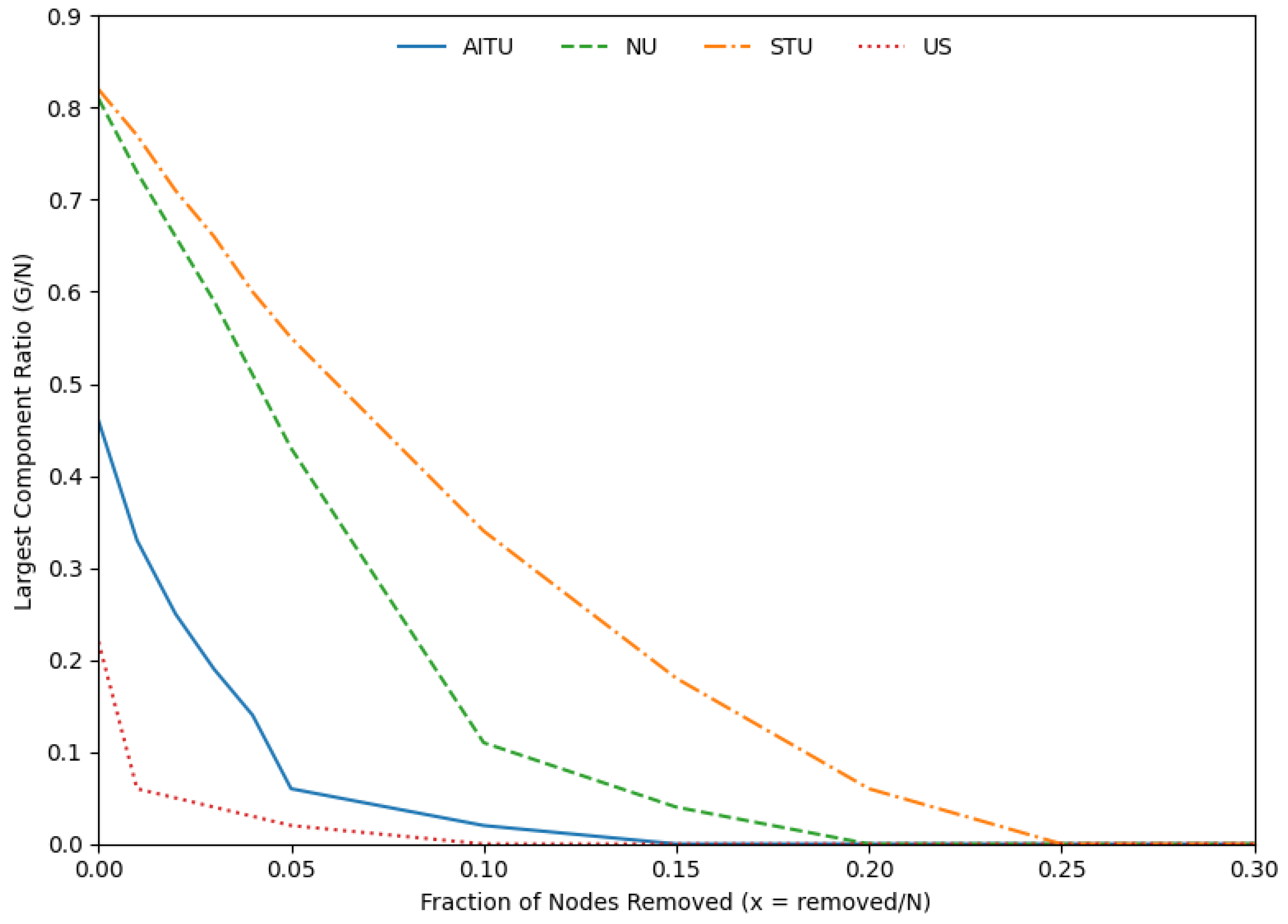 Figure 5 visualizes the comparative resilience of the four networks. The results clearly distinguish four patterns of network resilience: STU displays the highest resilience, NU maintains moderate stability, AITU shows improving resilience, and US collapses under minimal perturbations.