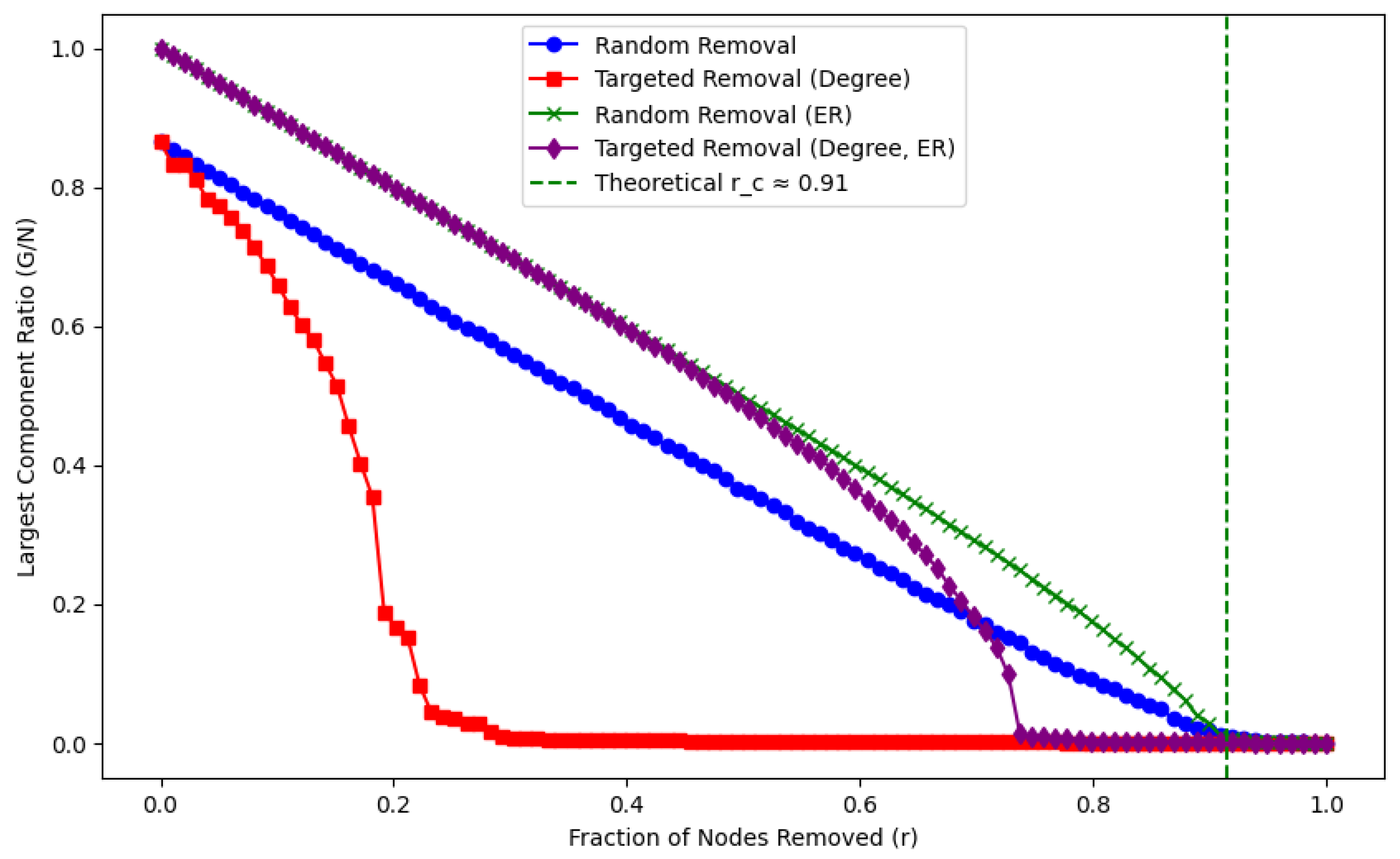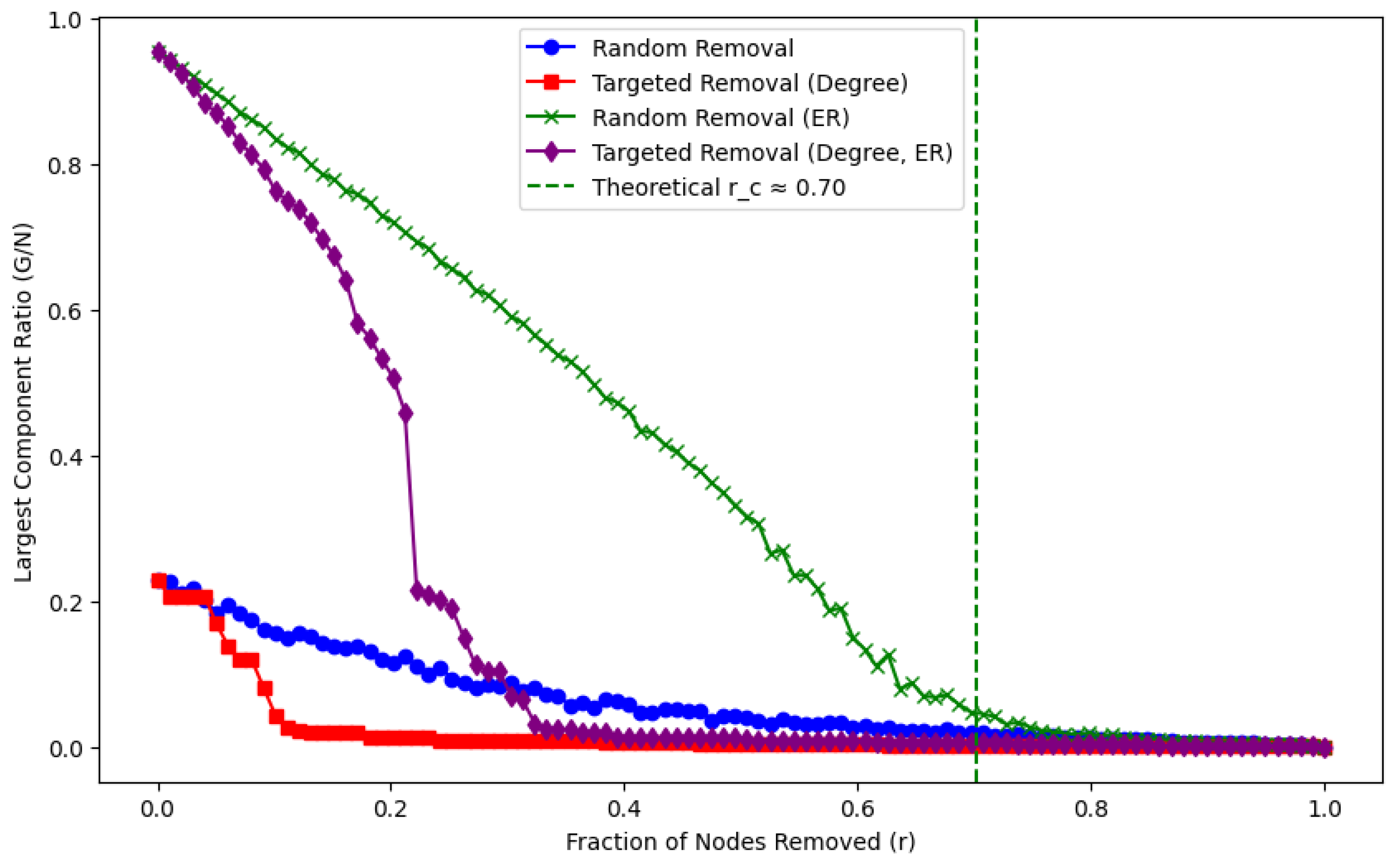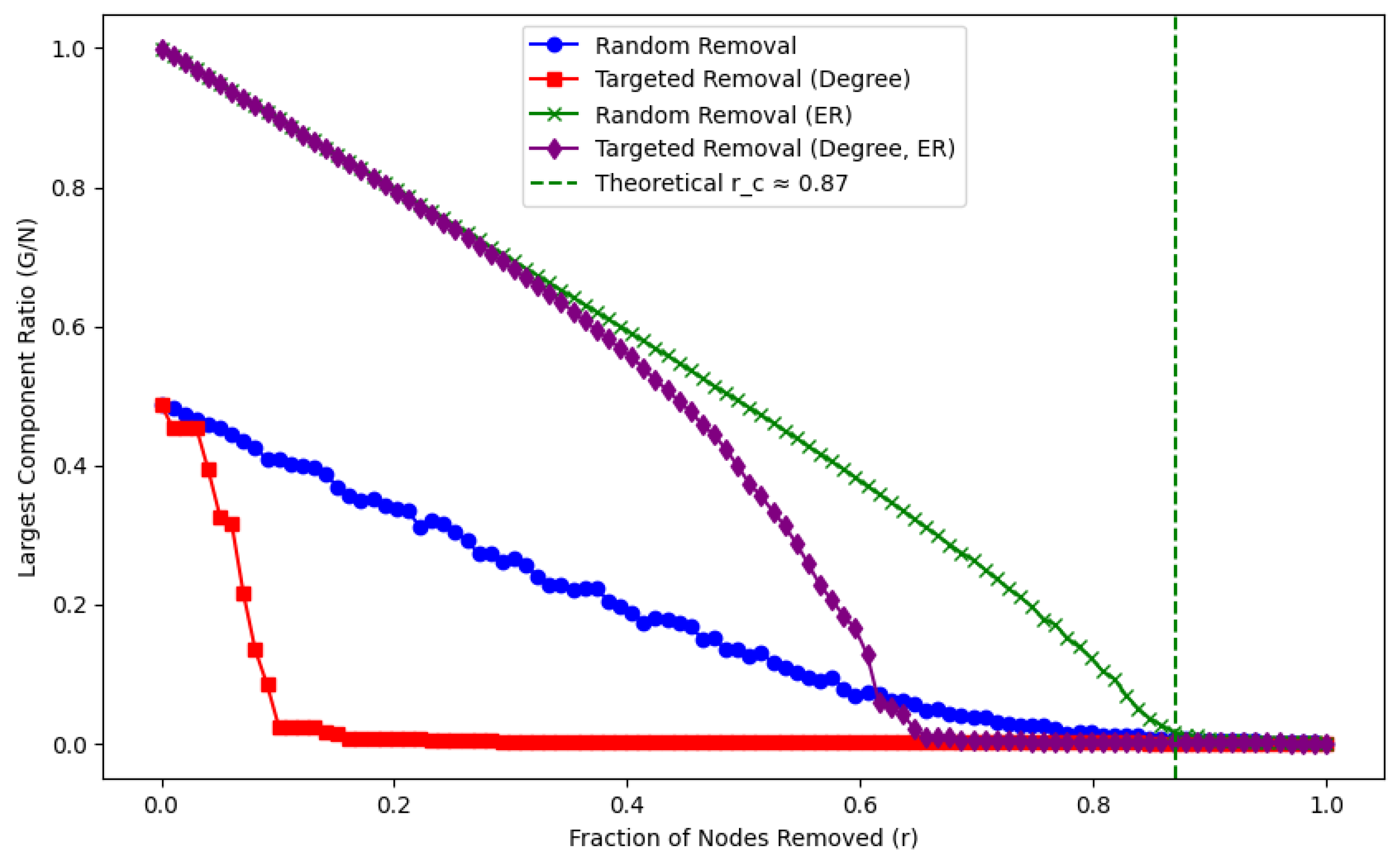 Figure 7 compares the scenarios of random and targeted node removal in the real NU network and its random counterpart based on the ER model. In the case of random removal, the NU network retains relative resilience. For the random ER network, a similar smooth dynamic is observed, although the critical threshold is reached later, which is consistent with the theoretically expected value (r ≈ 0.85). In contrast, targeted removal of high-degree nodes shows a sharp decline in the size of the largest component of the NU collaboration network after the removal of only about 10–15% of key researchers. In the random ER network, targeted removal has a much less pronounced impact, highlighting the specific resilience of NU as a real scientific community.