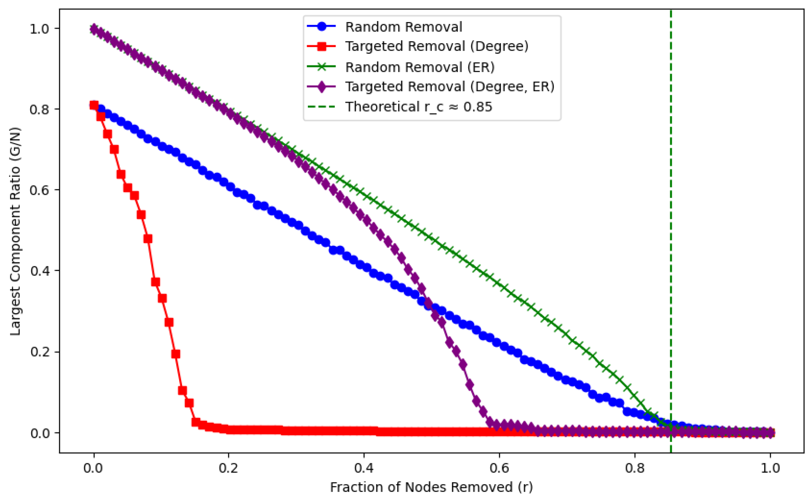 y-axis shows the relative size of the largest connected component (Largest Component Ratio, G/N). The blue curve illustrates that, under random node removal, the network retains its relative integrity even with gradual losses. The decline of the largest component is progressive, indicating the presence of alternative collaboration pathways and a certain level of redundancy in connections. Comparison with the green curve (ER model) shows that the empirical network collapses faster than a random graph of similar density, indicating greater structural resilience due to clustering and an uneven distribution of ties. The most striking is the red curve, corresponding to the removal of nodes with the highest degree centrality values. After the removal of just 10–15% of the most central researchers, the largest component almost disappears. This indicates a critical dependence of the network on a limited circle of key authors who ensure integration between different research groups. For comparison, the purple curve (ER model) demonstrates much higher resilience even under targeted node removal. The vertical dashed line represents the theoretical threshold for random removal in the ER model.