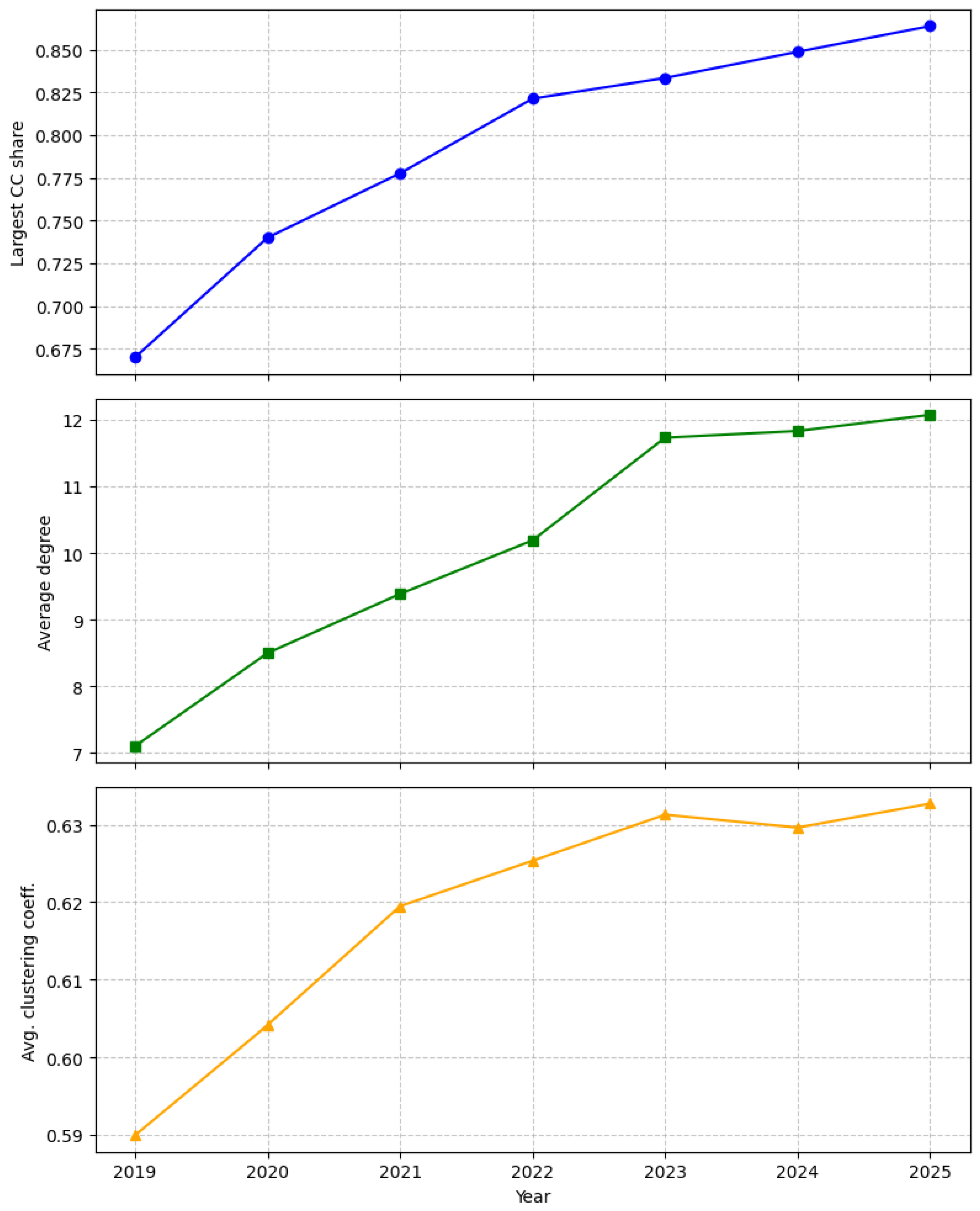 The share of nodes forming the largest connected component (LCC) serves as a key indicator of the integration level within each institution. For instance,