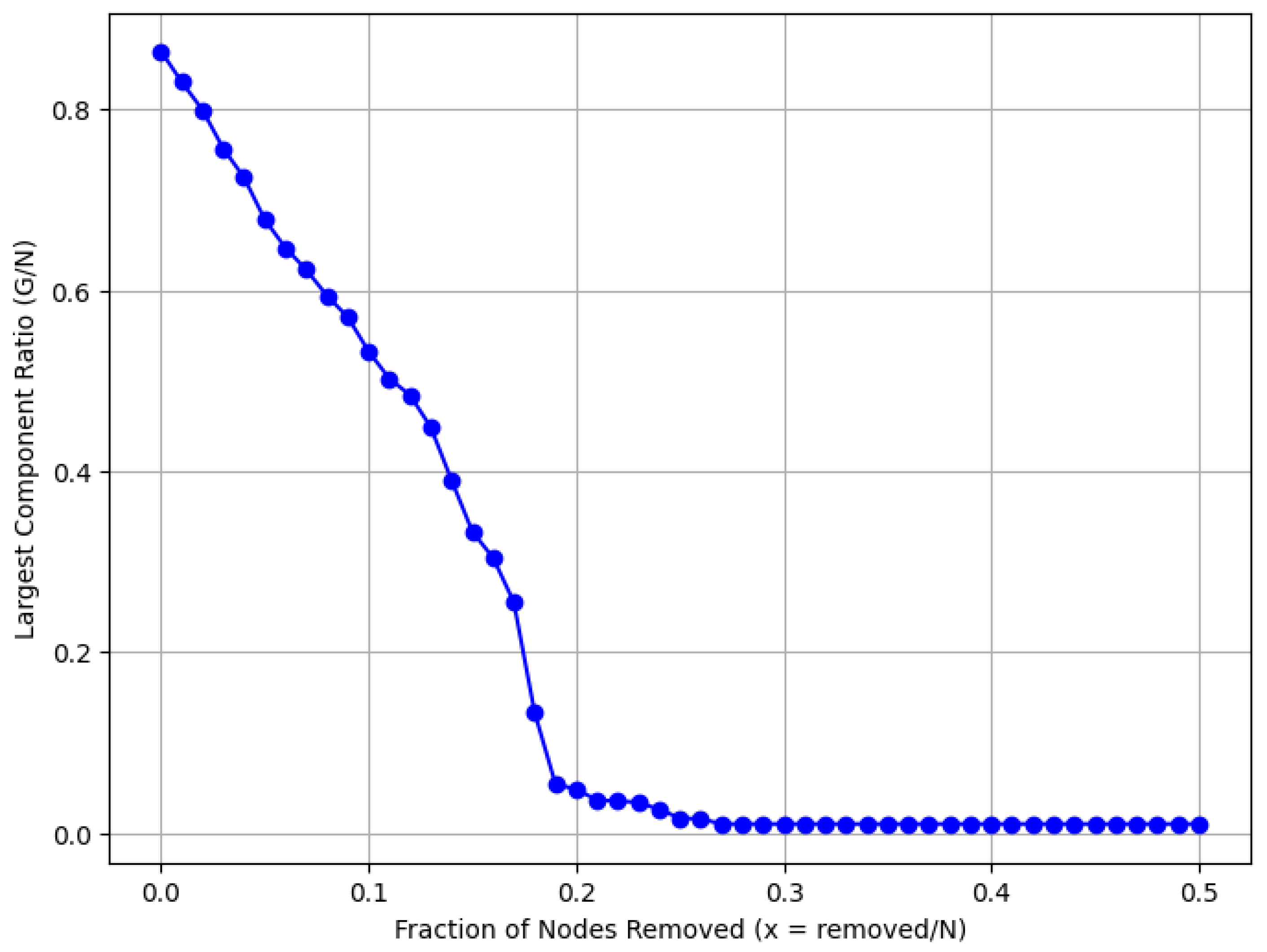 To evaluate structural stability, targeted node removal simulations were conducted, focusing on nodes ranked by betweenness centrality.