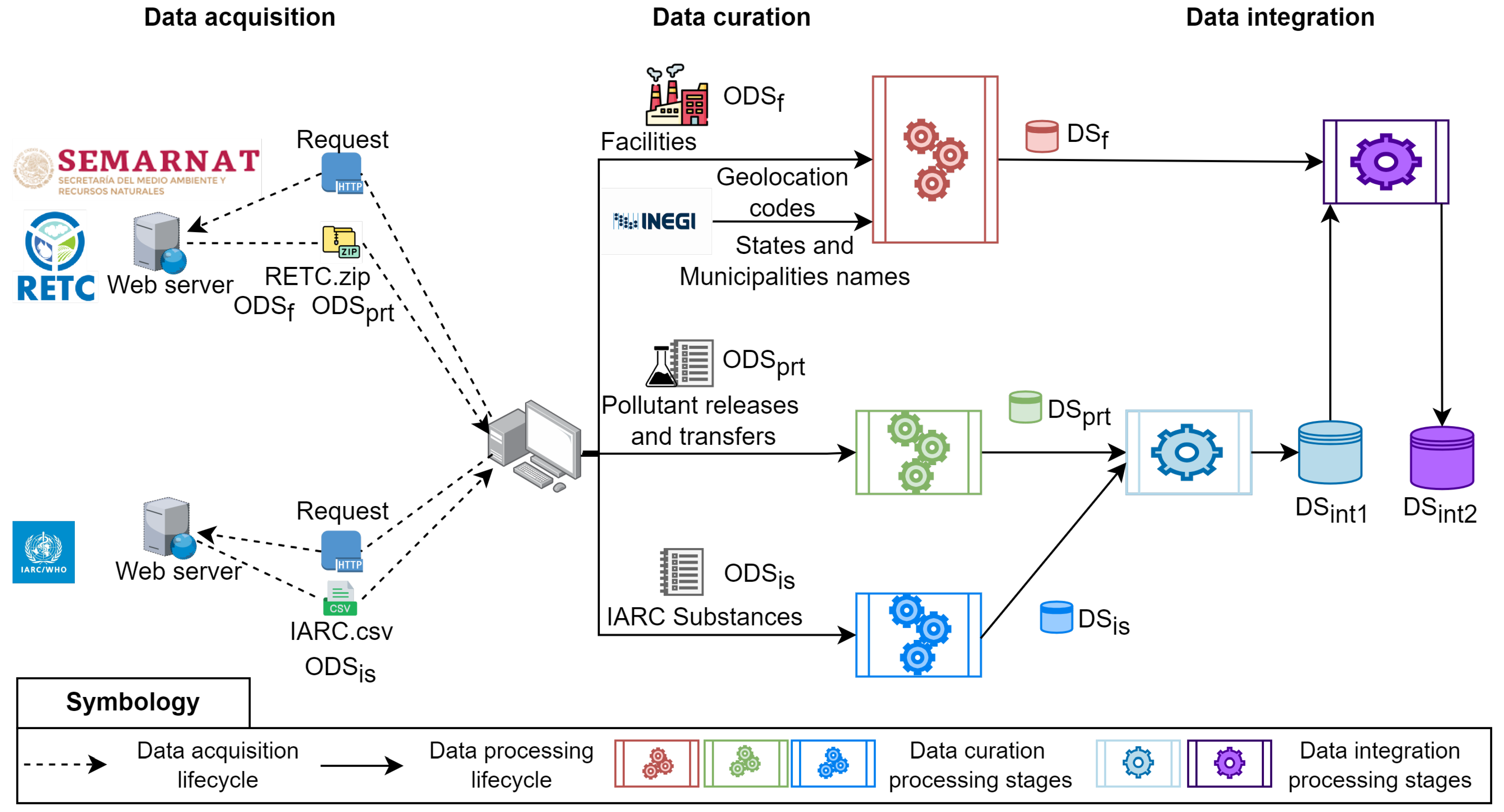 - Facilities dataset Stage : We added the state and municipality geospatial codes as fields ( and , respectively), producing the dataset (described in Table A4). This addition was also crucial for the entire integration process because the cve_ent and cve_mun fields became common across facilities and pollutant release and transfer datasets; thus, they relate these datasets to accurate geolocation of state and municipality names.At this point, the facilities dataset contains 27 fields. In this manner, the dataset produced by this process could be integrated with another public dataset by intersecting the geospatial codes.