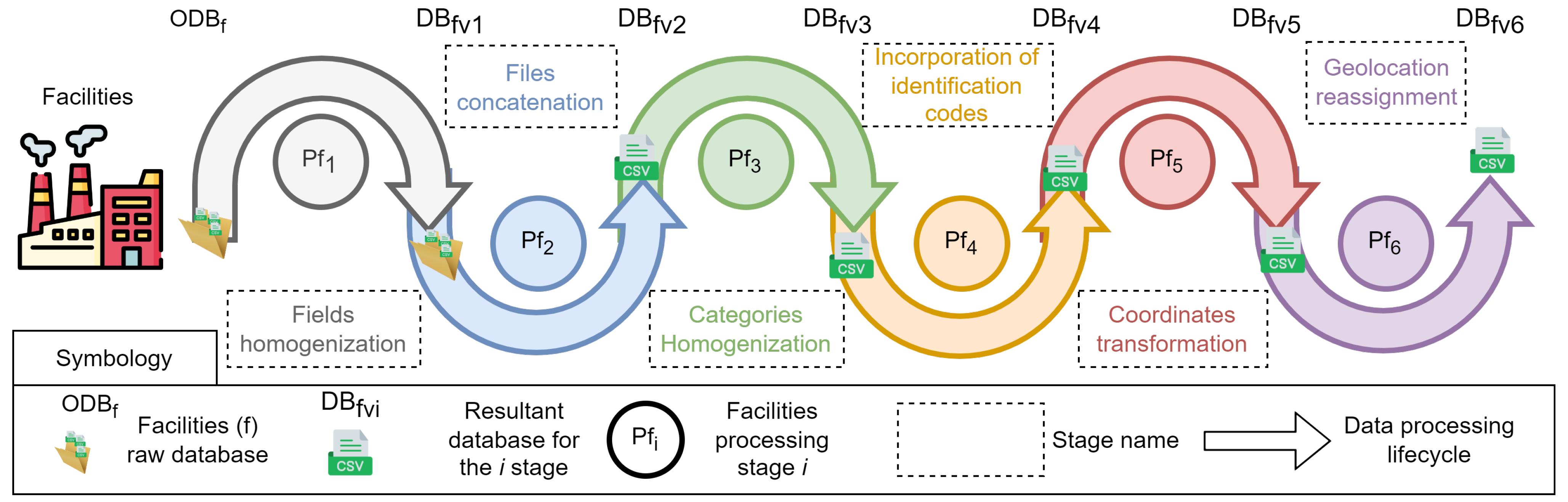 - Facilities dataset:The obtained facilities dataset () comprises 19 CSV files in raw format that require data preparation, imputation, and consolidation into a single, homogenized dataset. A facility is an organization (public or private) with some economic activity (commercial, industrial, services, etc.) that produces pollutant releases (to air, water, or soil) or transfers (to sewerage, co-processing, final disposal, incineration, recycling, reuse, treatment, and other destinations) of substances. For this work, we employed a six-stage methodology to address the inconsistencies identified in the dataset (duplicated data, different values for the same field, or unaccepted symbols). Figure 2 shows how the passes through the six processing stages () and produces a new version of the dataset (called ) for each stage until the consolidated dataset is obtained (). In this pipeline, i denotes the stage of the data curation life cycle.
