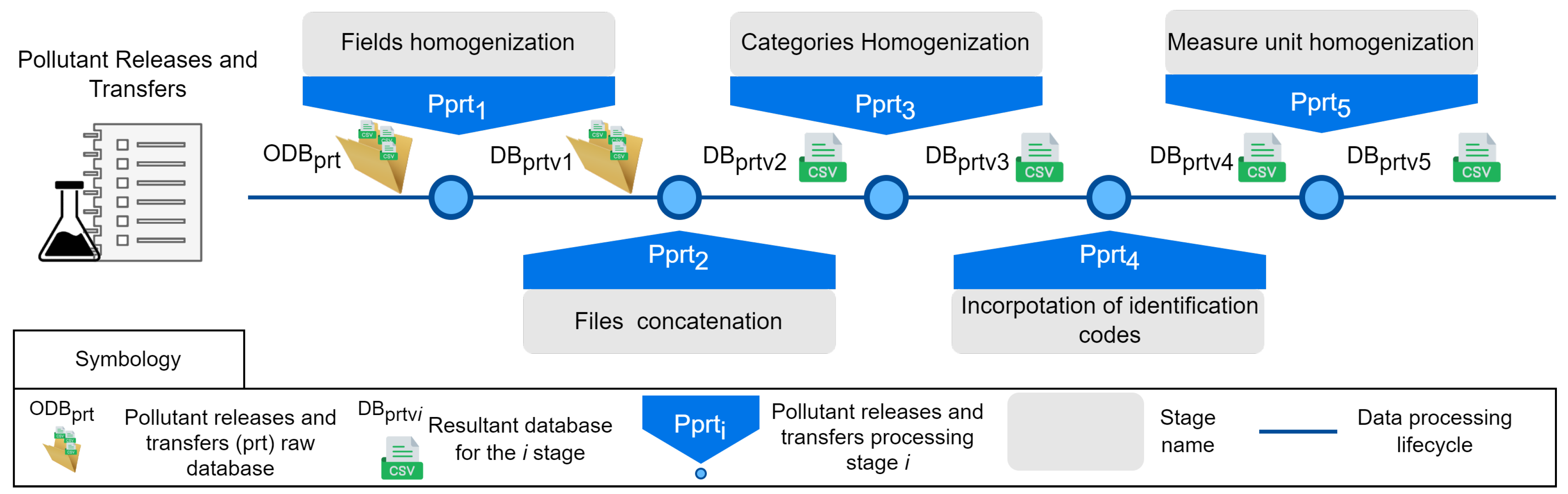 - Pollutant Releases and Transfers dataset: The obtained pollutant releases and transfers dataset () reports the amounts of pollutant releases and transfers by facilities from 2004 to 2022. It contains 19 CSV files in raw format that require data preparation, imputation, and consolidation into a single, integrated, and homogenized dataset. It consists of 20 fields, as described in Table A2. For this curation, we applied a five-stage methodology to address the inconsistencies identified in . Figure 3 shows how the passed through the five processing stages () and produced a new version of the dataset (called ) for each stage until the consolidated dataset was obtained (). The i index corresponds to the number of the processing stage.
