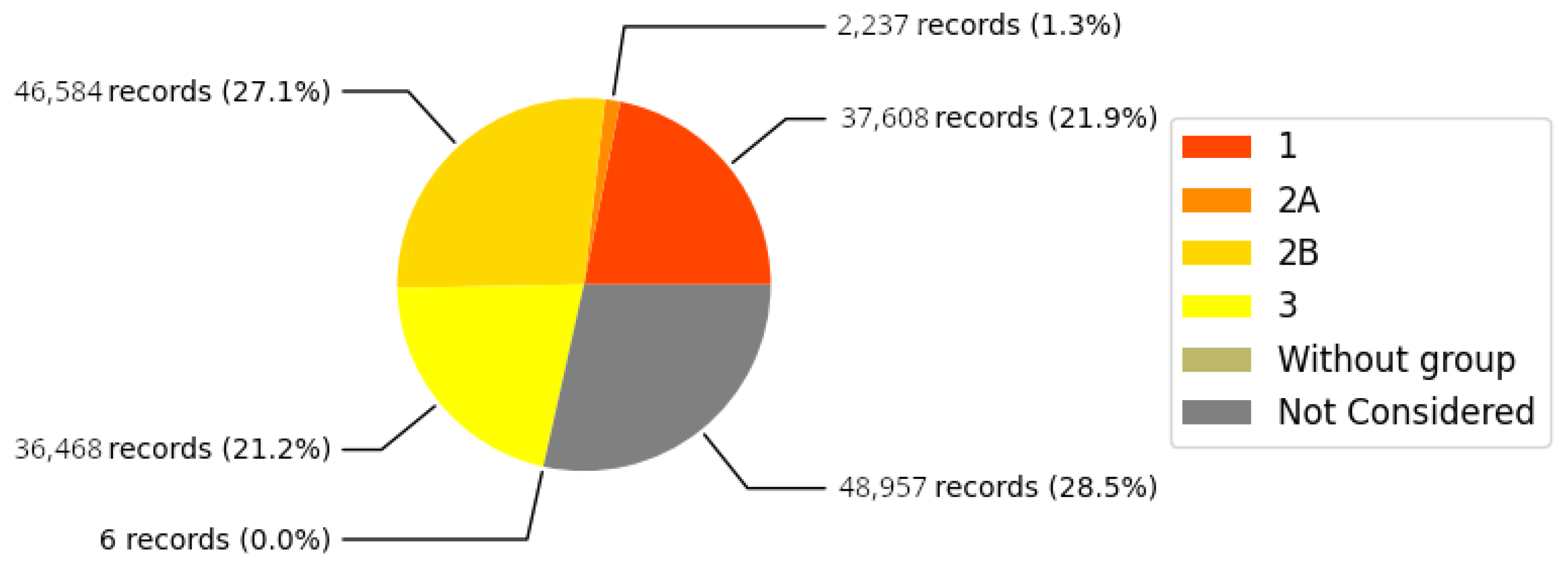 - Pollutant Releases and Transfers Stage : We also analyzed the fields from the 19 Pollutant Releases and Transfers annual reports and identified the same discrepancies as in the facilities dataset. By comparing these discrepancies, we identified three distinct formats and created three corresponding groups (, , and ). These groups contain the years’ values in the same format. By comparing these groups, we detected missing fields. Table 2 shows the number of missing fields per group and which fields were incorporated with a default value. Inserting one missing field of into the dataset represented a modification of 82.4% (141,629 records updated) of the 171,860 total records, with representing a modification of 9.11% (15,667 records updated) and representing a modification of 8.47% (14,564 records updated).
