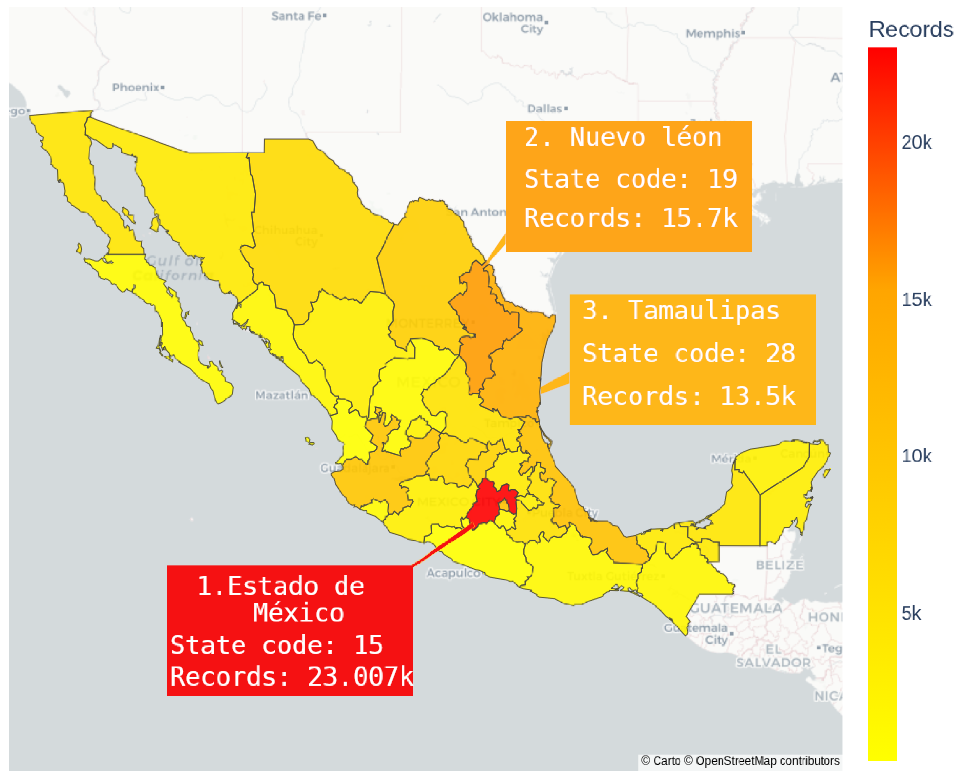 - State name: There are 32 states in Mexico. We analyzed the state name field in the and datasets. However, the dataset contains 64 values for the state name field because each state had two format names: uppercase and camel case (i.e., DURANGO and Durango). In some specific cases, the state names were larger (i.e., COAHUILA as Coahuila de Zaragoza) or were updated (i.e., Distrito Federal as Ciudad de Mexico). We defined a consistent and official catalog of states by using the states’ names according to the National Institute of Statistics and Geography (INEGI, by its Spanish acronym)4. During , we updated the values of the state name field in following the process described previously. In this process, we updated 164,451 records (95.68%) of the 171,860 total records for this field. Considering the total of 21 fields, this update accounted for 4.55% of the dataset.